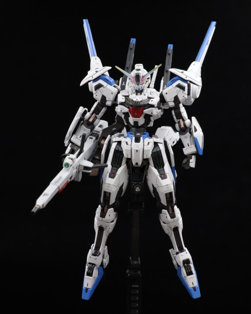 バリアブルロッドライフルは取り回しの良いように、クアドラスラスターを腰部に移動しています。スコープや冷却タンクなどを追加し、兵器感を上げてみました。