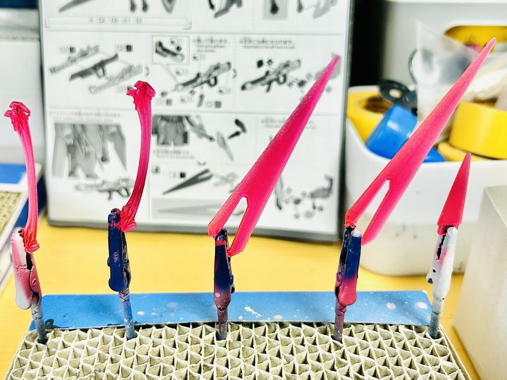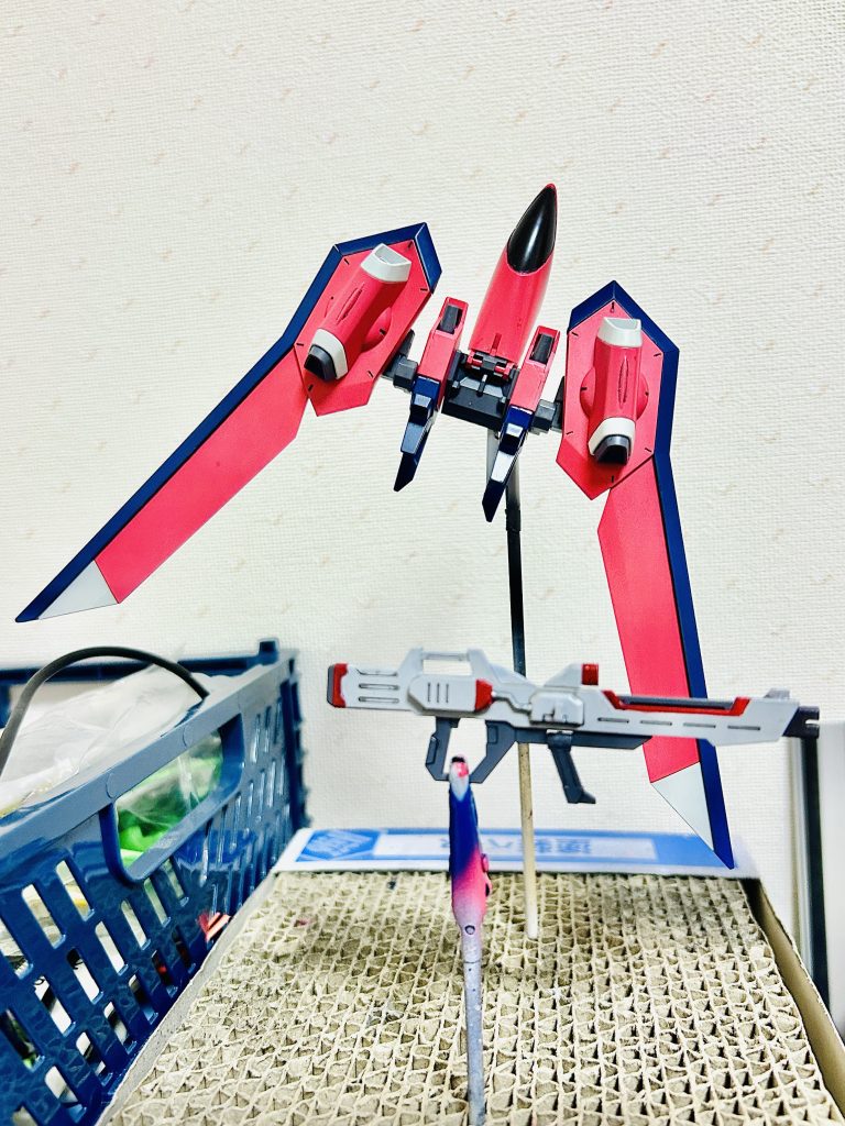 少し前に完成したイモータルジャスティスです。劇中あんまり活躍しなくて、シンにもハマってなかったかもしれんけど、こうして見るやはりカッコイイ。シールド塗り分け以外は、パーツ分割が優秀で塗装もしやすい。さすがは今のキット。メインのピンク部分は、ルナマリアピンクを使用。本体はグレーサフ、バックパックはピンクサフと、同じピンクでも違いが出ればと思ったけど、全然分からんや。(笑)ビームパーツにシャインシルバーを軽く吹いてラメっぽい感じにしてます。
