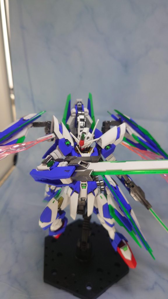 グリーン部分は蛍光塗装をしたので光ります。GNソードビットも光るので全身が煌びやかになります