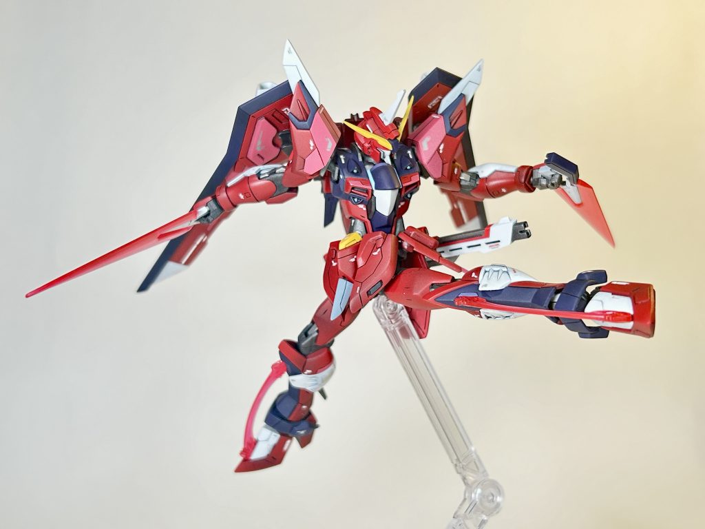 脚部はもともと延長ギミックがありますが、伸ばした時の特に正面からのシルエットが悪いので、股関節部分で左右に広げて、太ももも少し延長しヒロイックな姿勢が似合うようにしました。