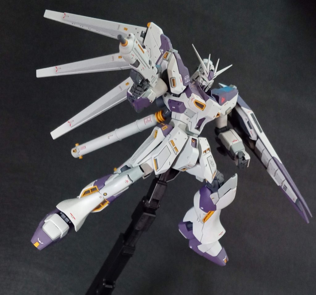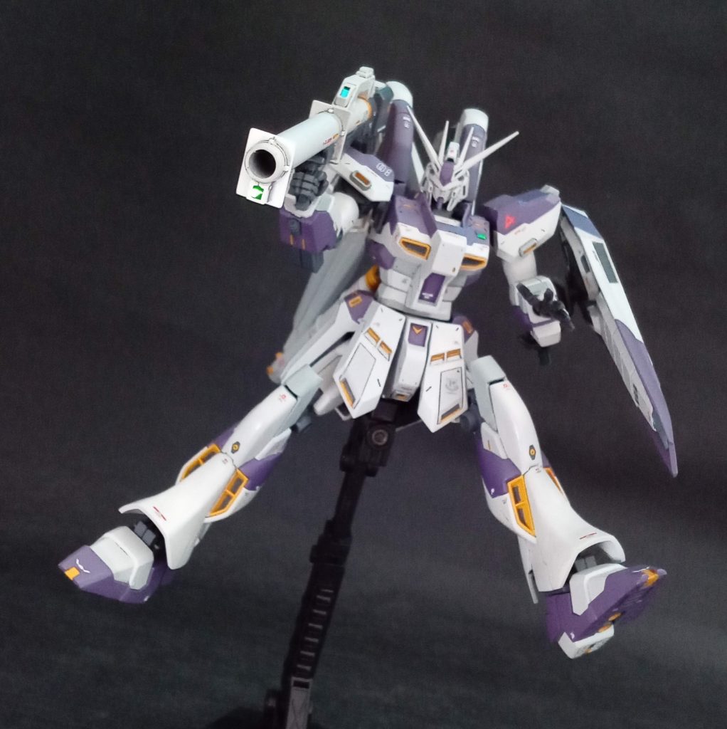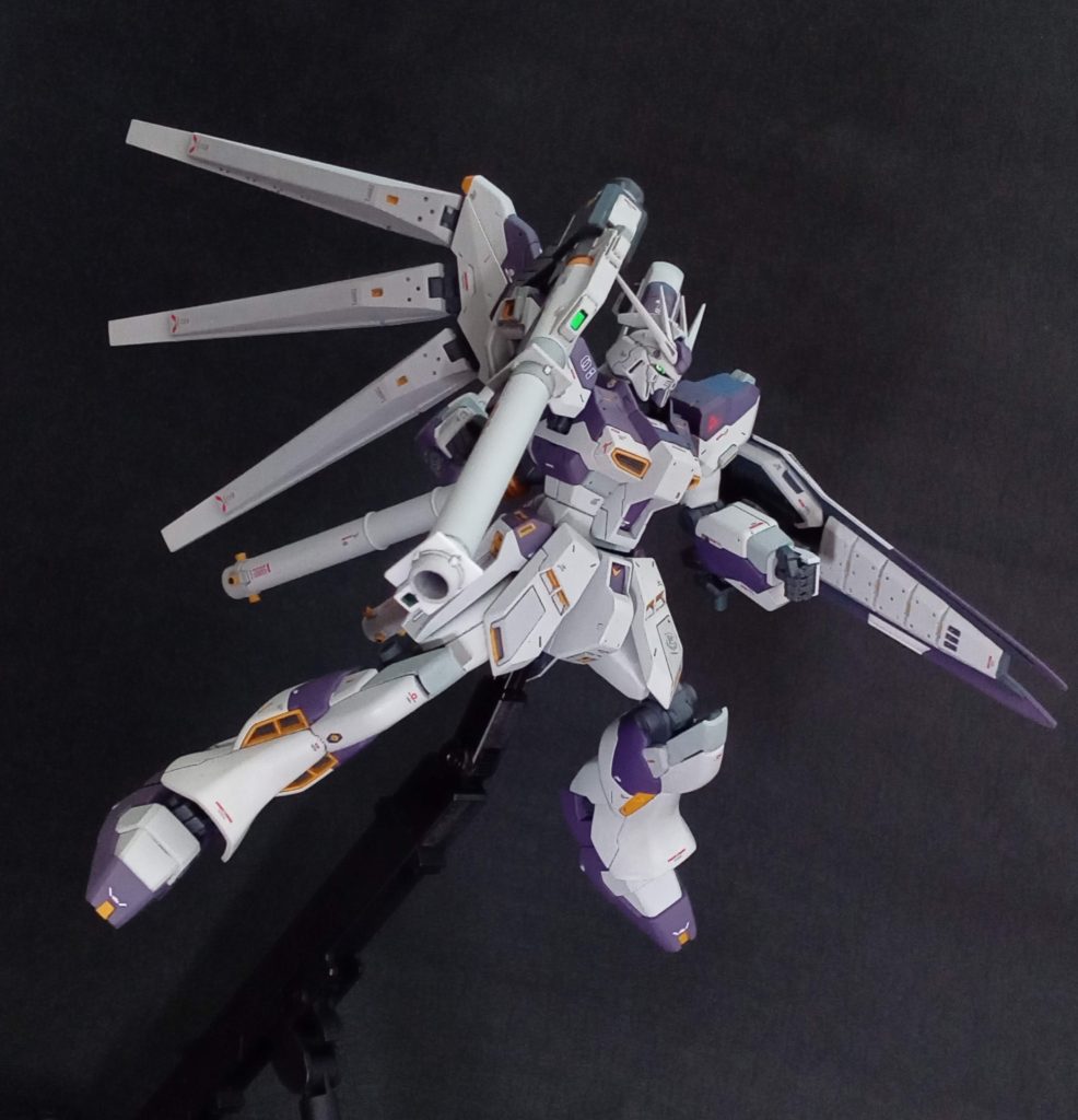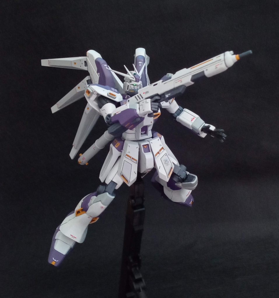HGのhi-νガンダムを頭部改修、胴延長、脚部延長をメインにほぼHGのままで色で印象かわるかなーと改修しました(RGのhi-νを改修した後なので、変に改修してもなーって(笑))。自分のhi-νの紫ver.のカラーパターンで。