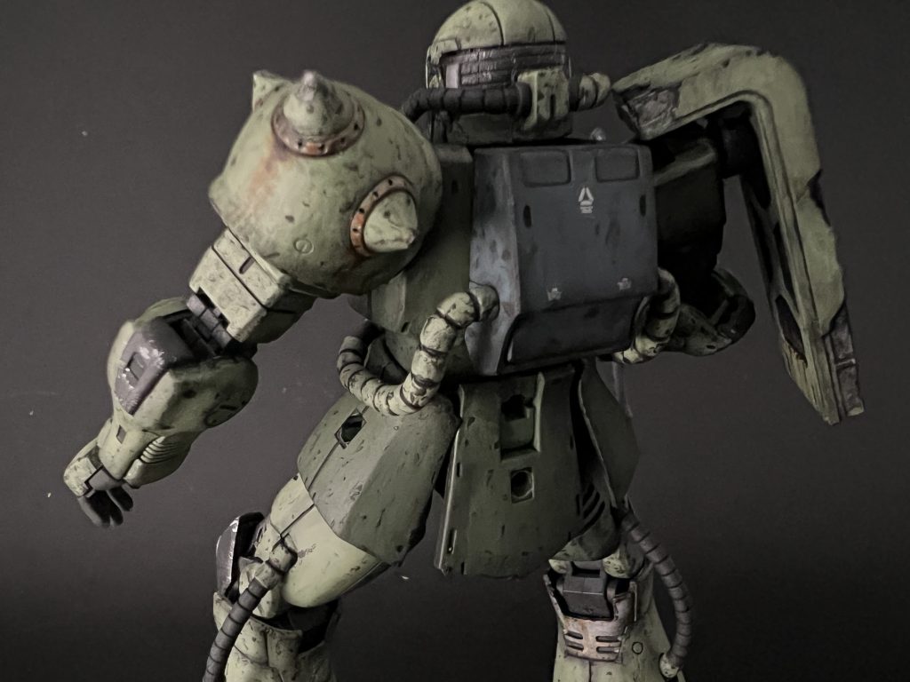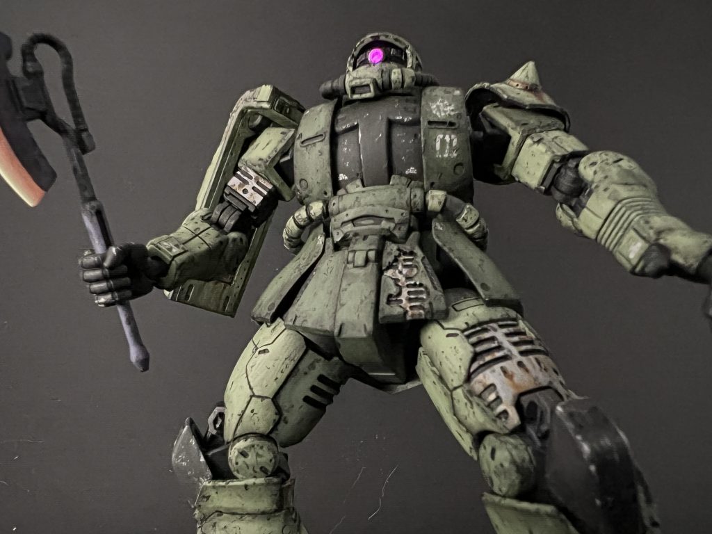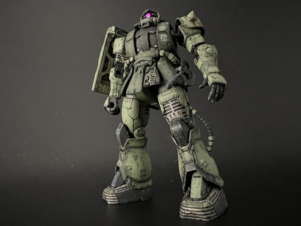 完成おめでとうございます!フレームと装甲が丁寧に塗り分けられていて、迫力がありますね。ウェザリングも上手で、さらに迫力がマシマシです。残念ながら「ドアン」は見ていないのですけど、ストーリーが伝わってくる作品、ステキです!そして何よりモノアイびこぉーんですね。
