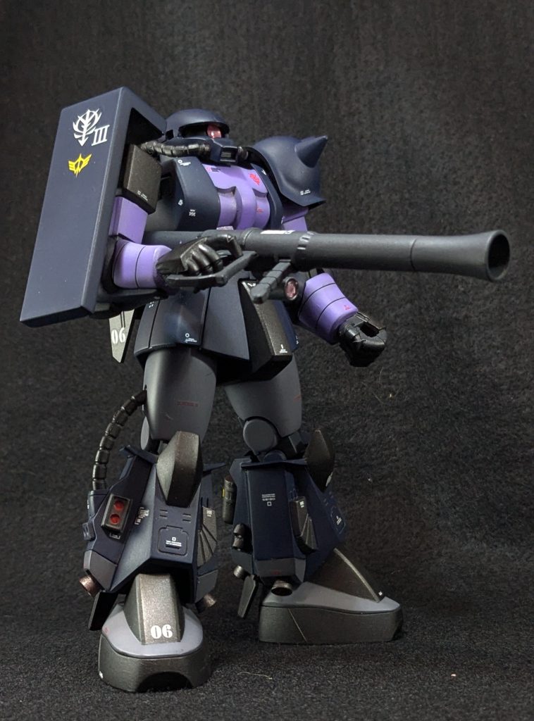 どうせなら両肩スパイクアーマーにしたかったのですが、持っていないので保留です。あと脛のジオンマークが1枚しかなかったのに、乾燥後に破いてしまったので、同じデカールが入ったガンダムデカールが再販されるまで完全な完成はお預けです。