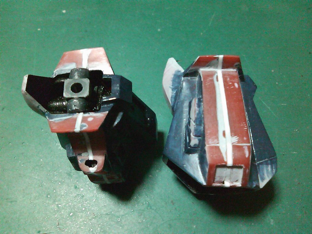 前腕の後ハメ加工と肘横の丸いパーツを大型化してます。あと長年放置していた所為かPC受けが砕かれてしまったのでプラパイプで再生してます。