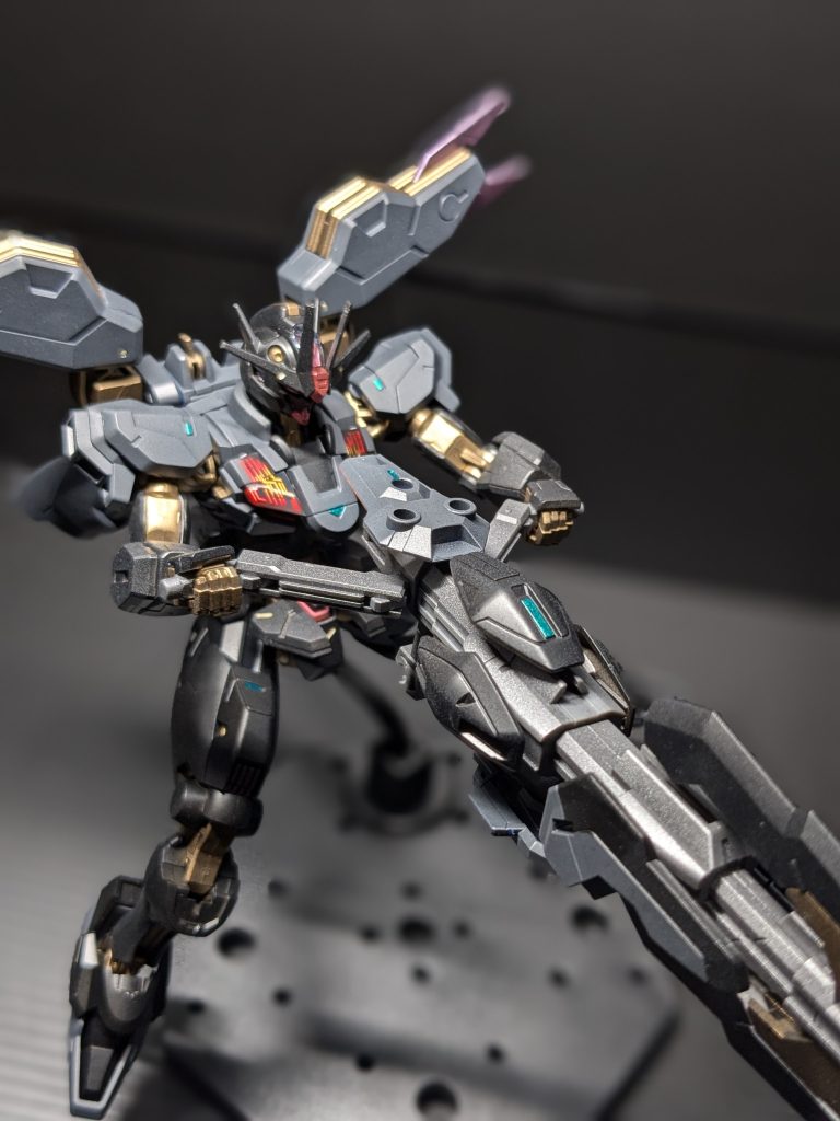 塗装は黒サフをベースに黒部分はフラットブラック金色部分はGXレッドゴールドを吹いてます。紫部分は同じくGXメタリックパープルです。顔部分などの赤部分に関してはGXメタルレッドにイエローゴールドを混ぜてます。デカールはめんどくさいのとあまり好きではないので貼ってません。