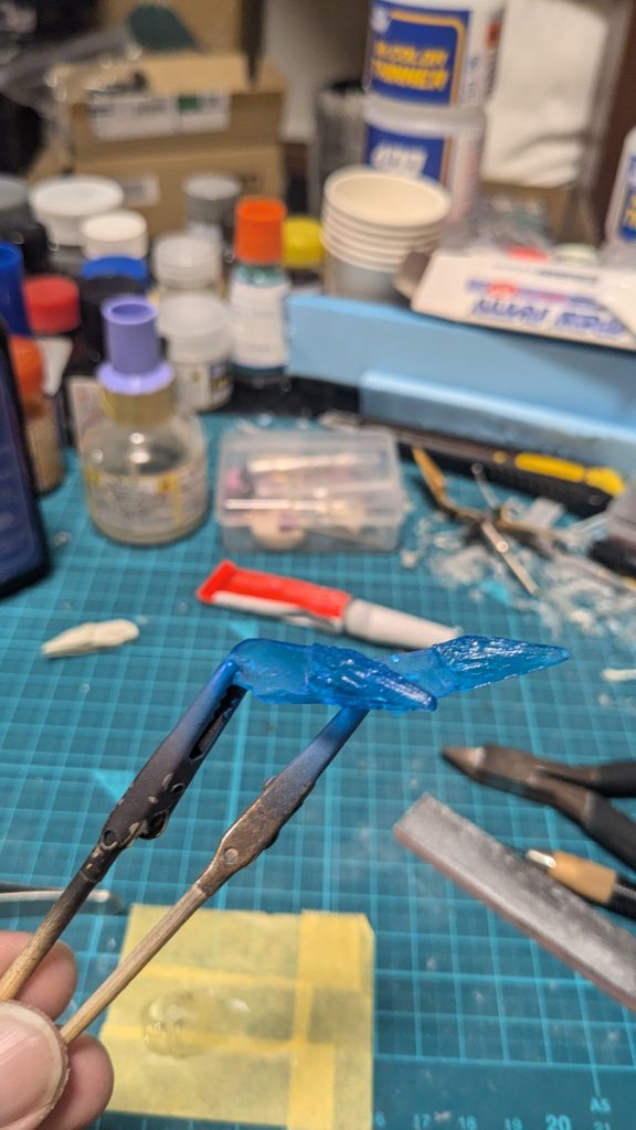ドラグーンの噴射エフェクトはエポキシパテで成形しUVレジンで複製しています