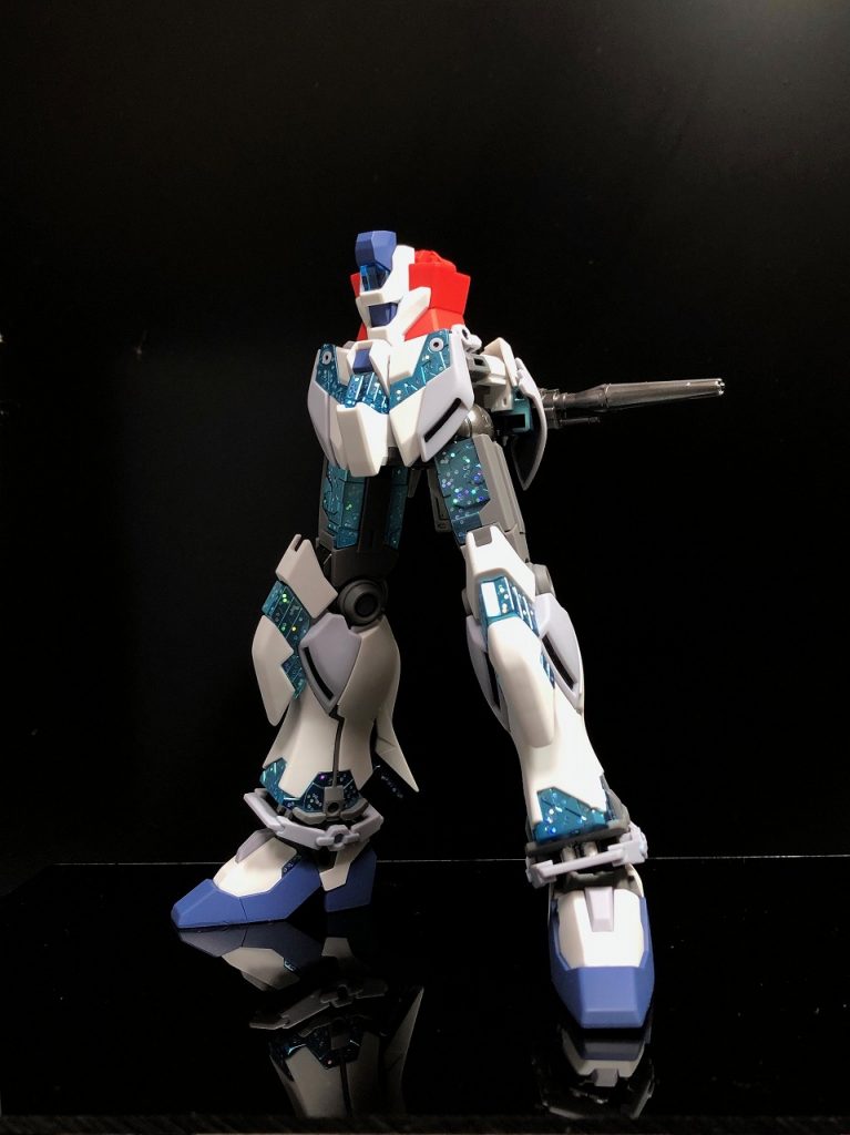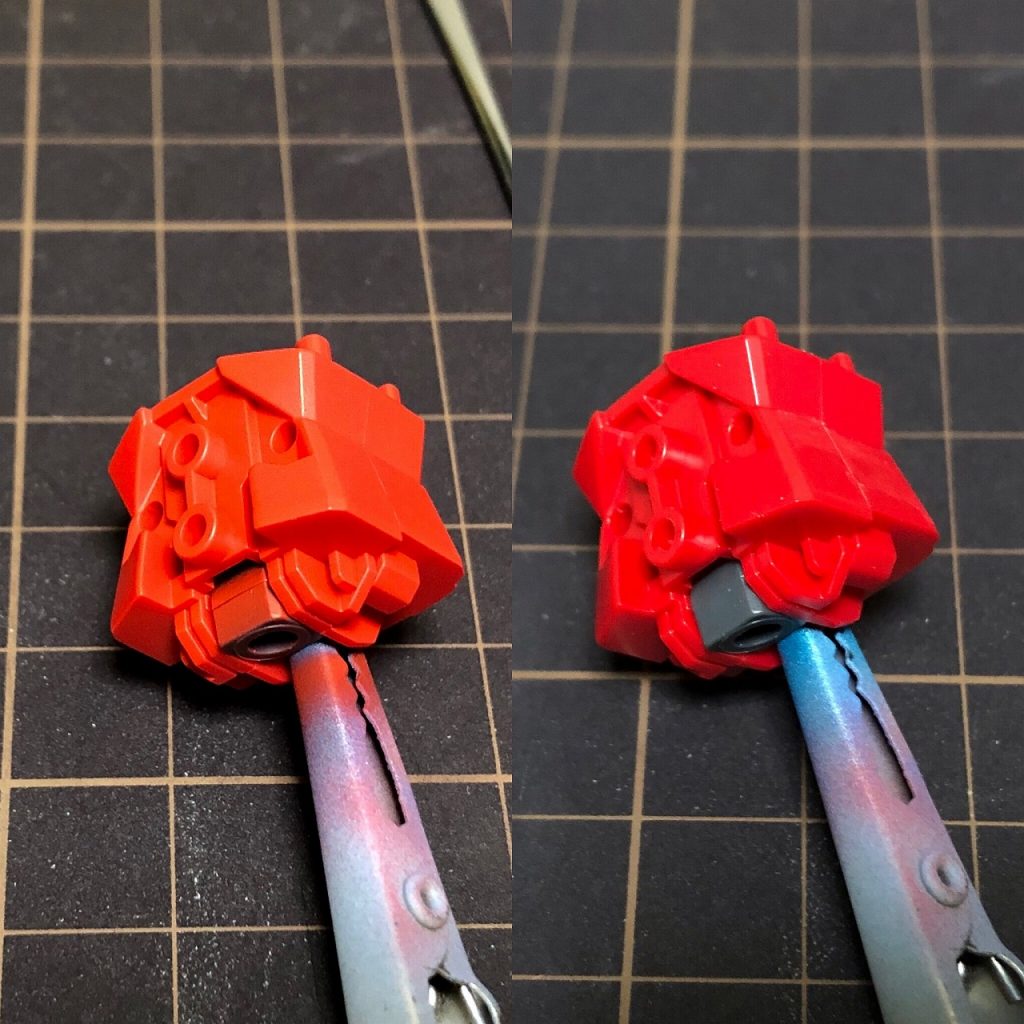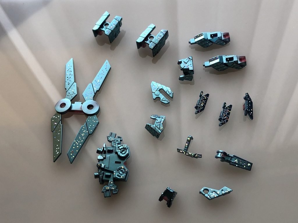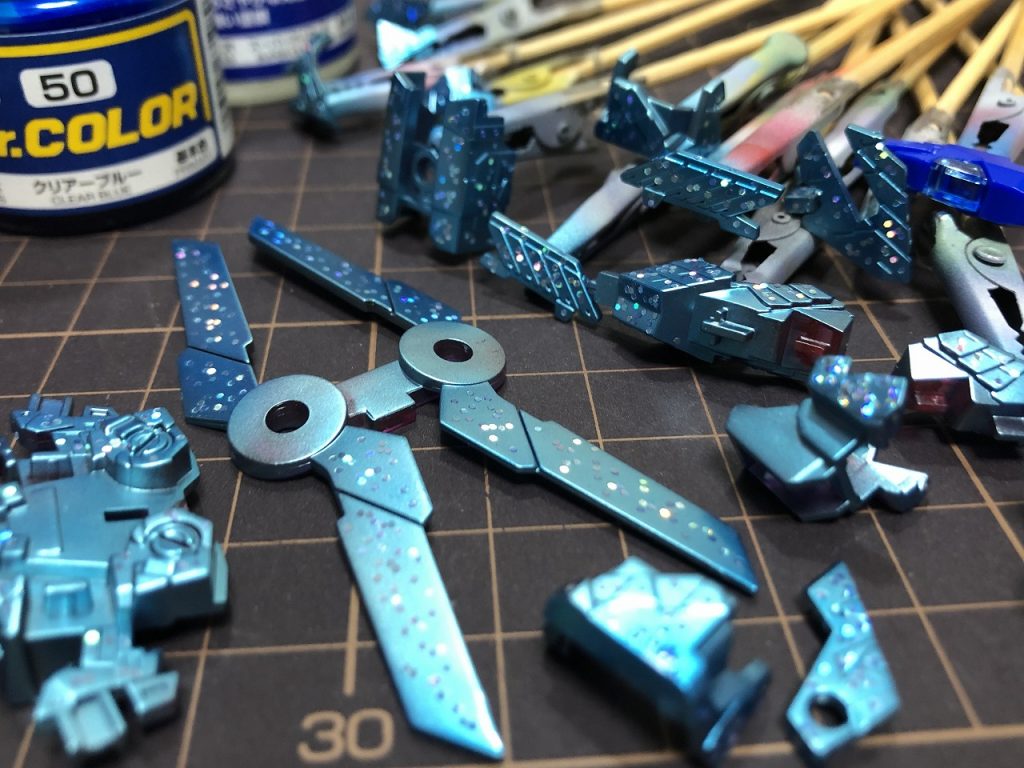 下地のターコイズメタリックと上に重ねたクリアーブルーでグラデーションになって、左右でサイコフレームの色が違って綺麗に撮れました。