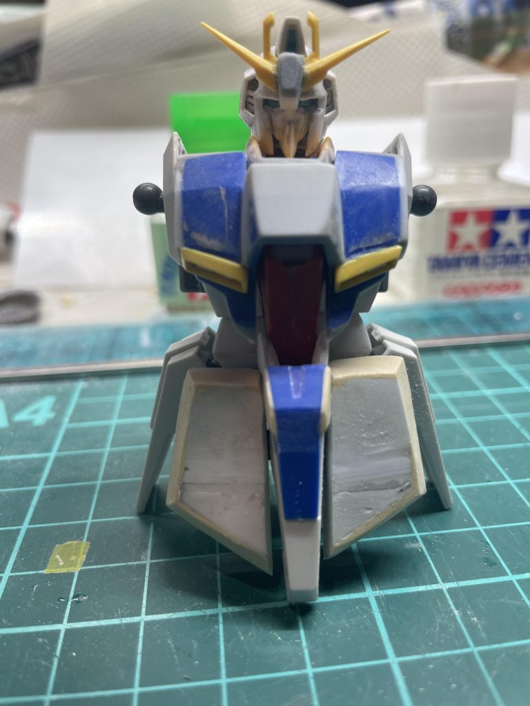 胸部………幅増し、角度変更、真ん中を大型化、ダクトはRGから流用し中をプラ板でディテールアップ。エリはプラ板とパテで大型化。