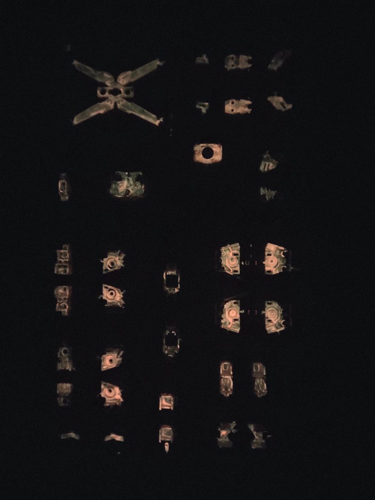透明パーツ裏に使った蓄光塗料が、いい感じに光ります。