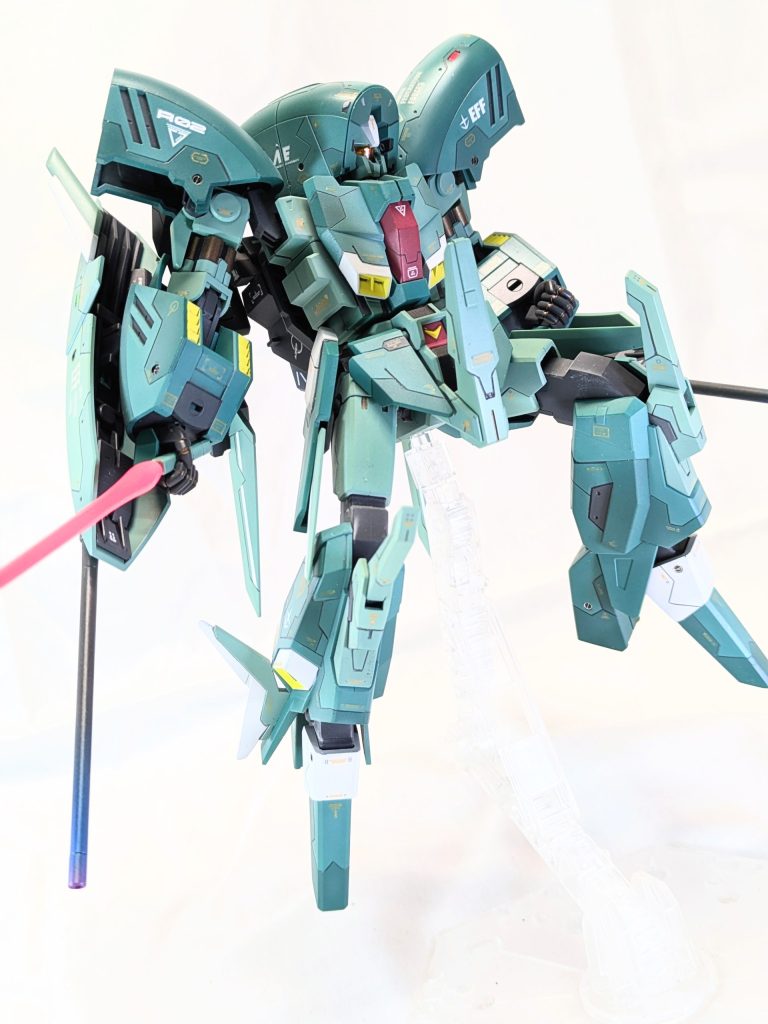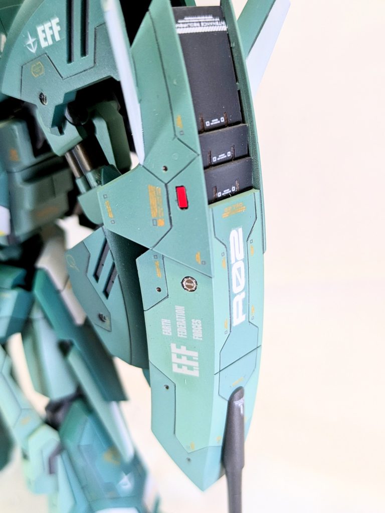 連邦系にしては表面積があるのでスジボリを行い、レッド・グリーンチップ、メタルパーツを敷設。デカールは過去最多の130枚以上を貼りました。カラーリングは劇中カラーをややホワイト寄りに実施。