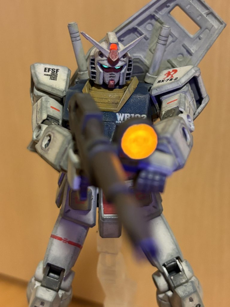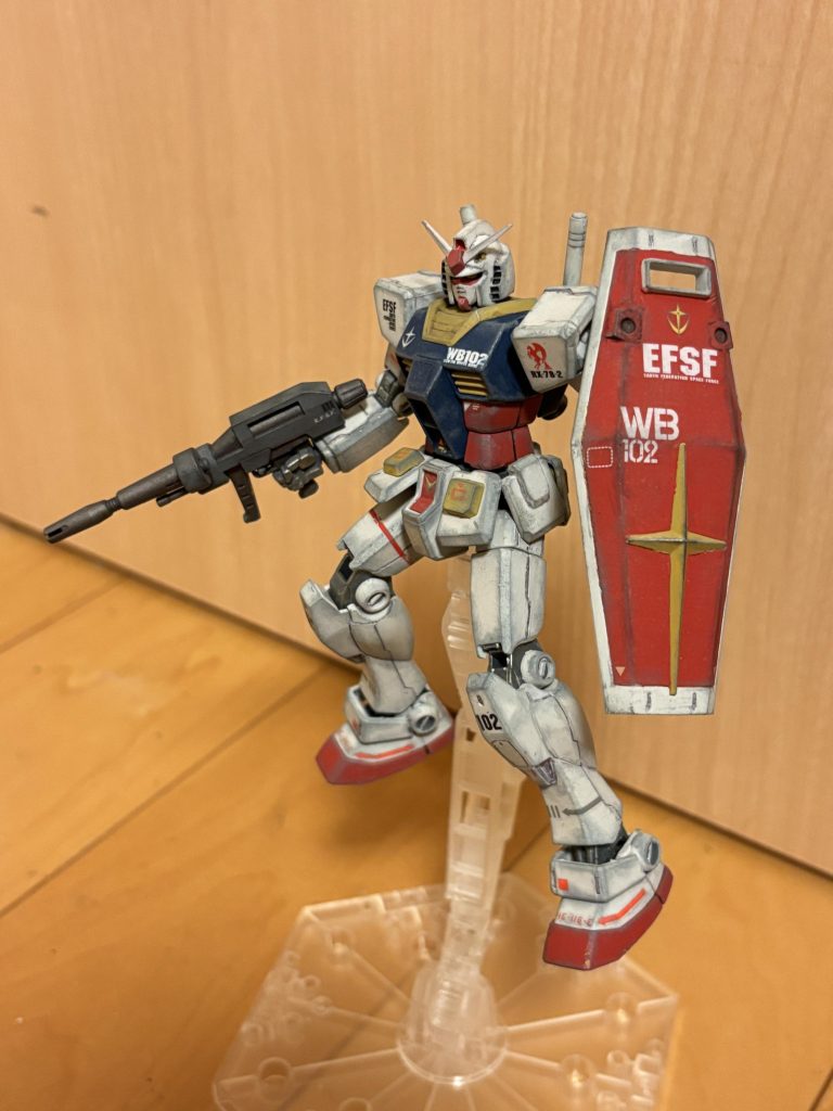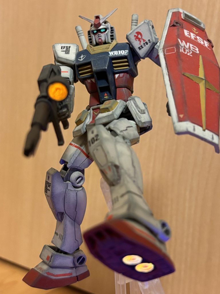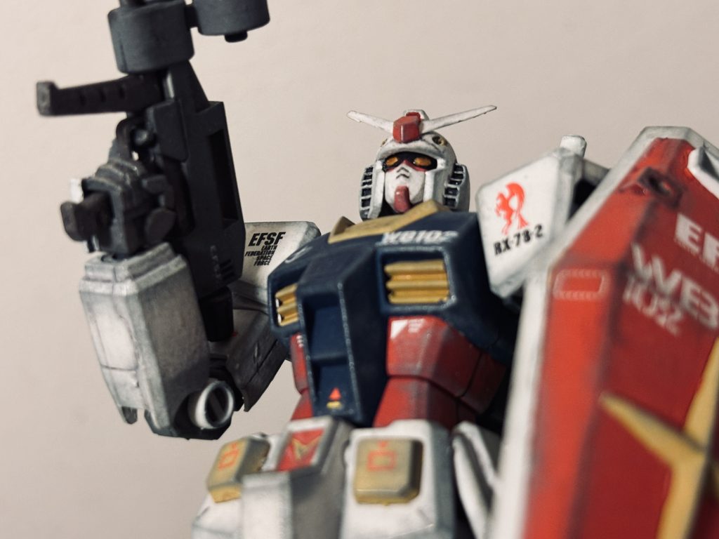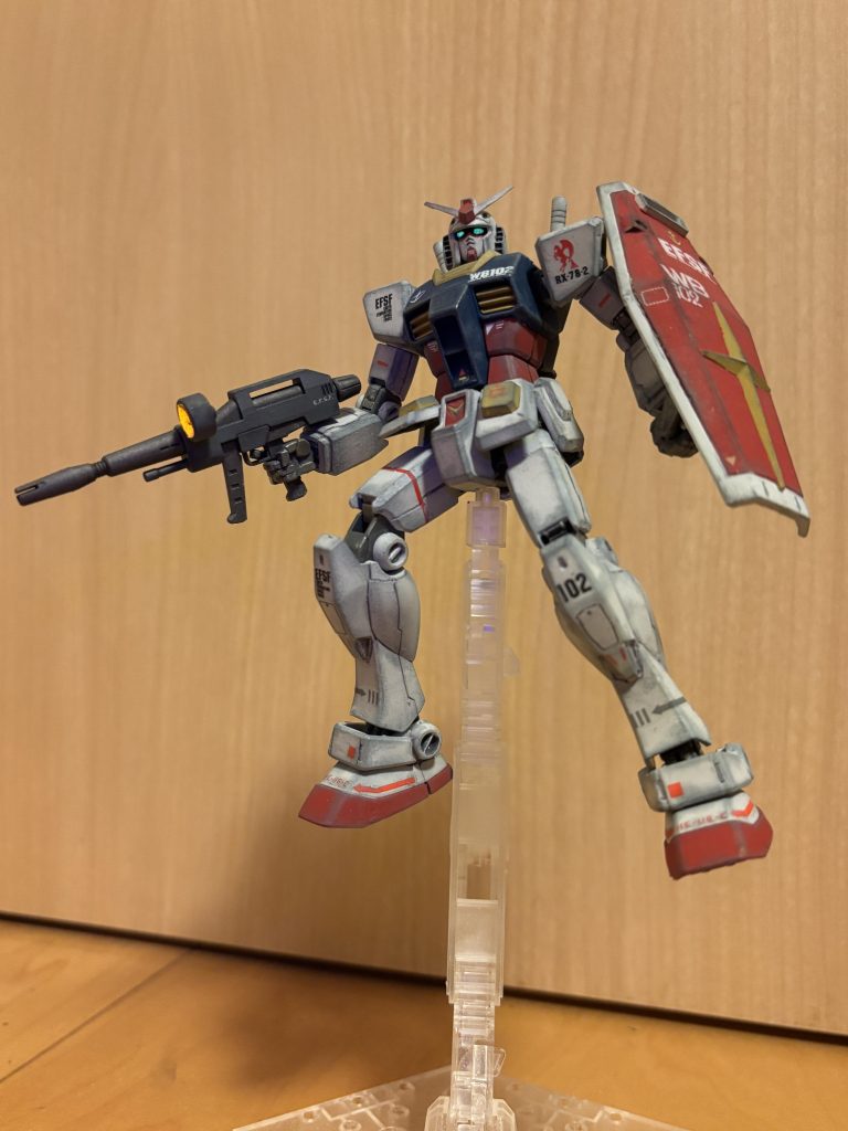 このガンダム、色味や立ち振る舞いがすごく私の好みで感動しました!いつかウェザリングとか全塗装とかしてみたい物です。ただ素立ちさせるだけでもここまでカッコよくなるとは…。1モデラーとして参考にしよう。