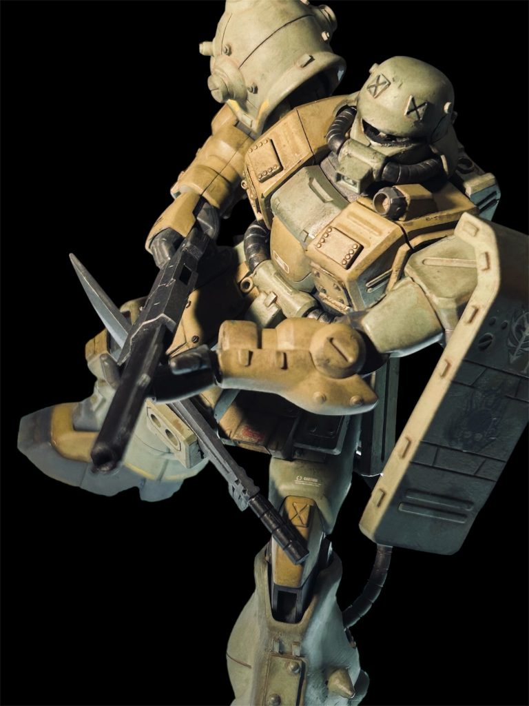 泥臭いミリタリー感溢れるザクⅡ改、めちゃくちゃ渋いですね〜!山刀をフロントスカートに装備するアイディアも新鮮ですね👍使い勝手も良いですし、ビジュアル的にもカッコ良いです✨