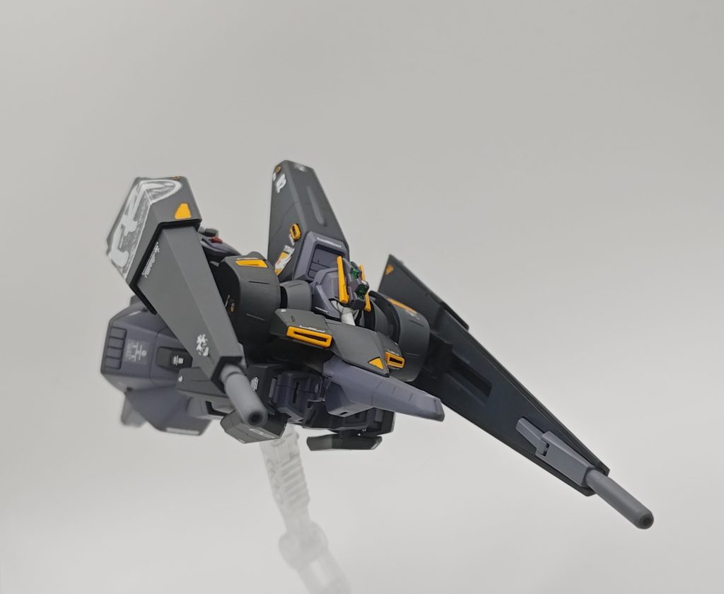 わかりにくいですが・・・脚部スラスターが装甲で隠れているデザインでしたのでしっかり見えるように開けました。スラスターはメタリック仕様にしてアクセントにしています。