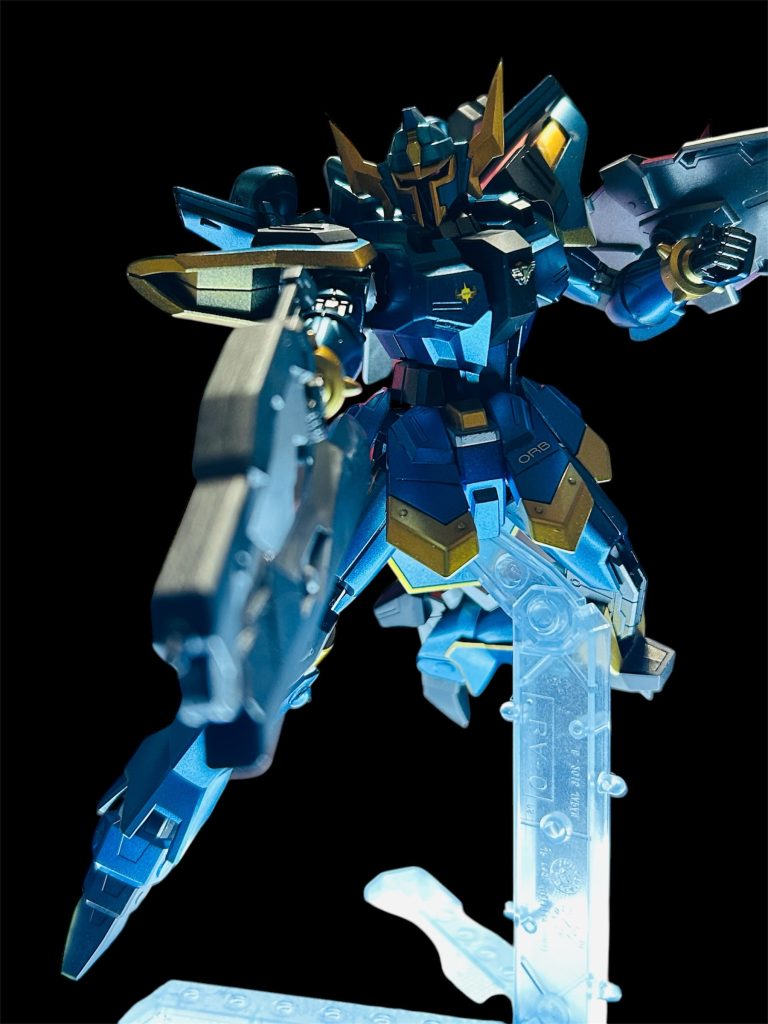色を変えると結構ヒロイックになるなあ、と思いました。メタリックブルー、スタブラゴールド、セミグラスブラックで塗り分けました。フロントスカートはプラ板、胸には鳥のリレーフを付けました。