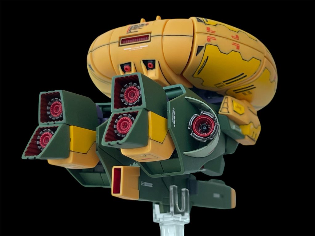 バックパックにはホームセンターで買った安い金属パーツをバーニアとして取り付けました。さらにこのバーニアの内部に、使用済みのギター弦の端についてる金色のドーナツ型のパーツを埋め込んでいます。