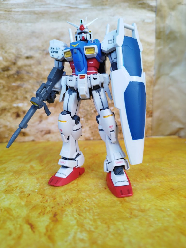HGUCのガンダムGP01です。去年の再販で入手。奥さんに買ってもらいました。積んでましたが、RGのGP01を購入できたので役割はそちらに、と、積みプラ崩しの軽い気持ちで作りましたが、なんと、良スタイル!しかも、実質VerKa……MG出てないし。古いキットにも関わらず、このスタイル…MGより後発で発売されコア・ファイターギミックをオミットしたことも関係してるのでしょうが、メチャ良スタイル…塗装しよう悩んで飾ったままにしてたら、なんか可哀想になってデカールハリハリ…胸のVも塗装(これメチャメチャ難しい)、取りあえず置いておくぶんには悪くないようにテコ入れ。でも、関節をメカサフヘビィ化したいのであえて合わせ目消さず…