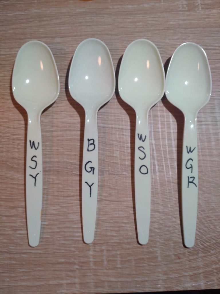 配色は、サーフェイサー3色、下地の金銀で2色、クリアの3色で3×2×3=18パターンを100均スプーンに塗装してどれを使うか吟味しました。やる前は面倒な工程そうだと思っていましたが、やってみると「 俺、モデラーっぽくない!?」と妙にテンションが上がって楽しかったです(^^)