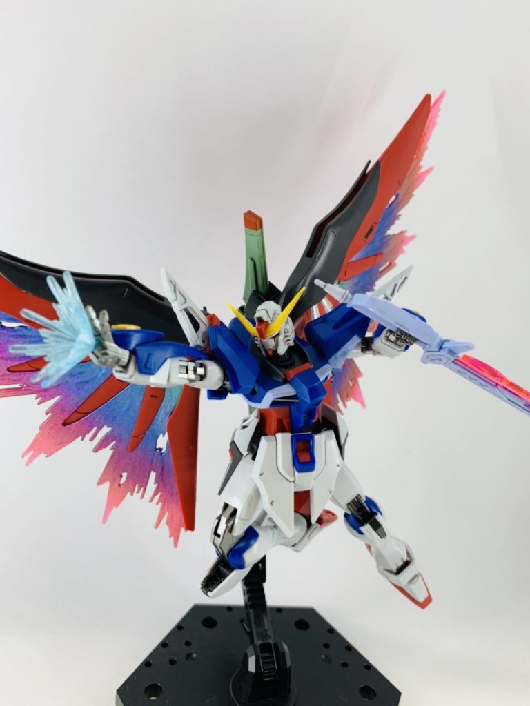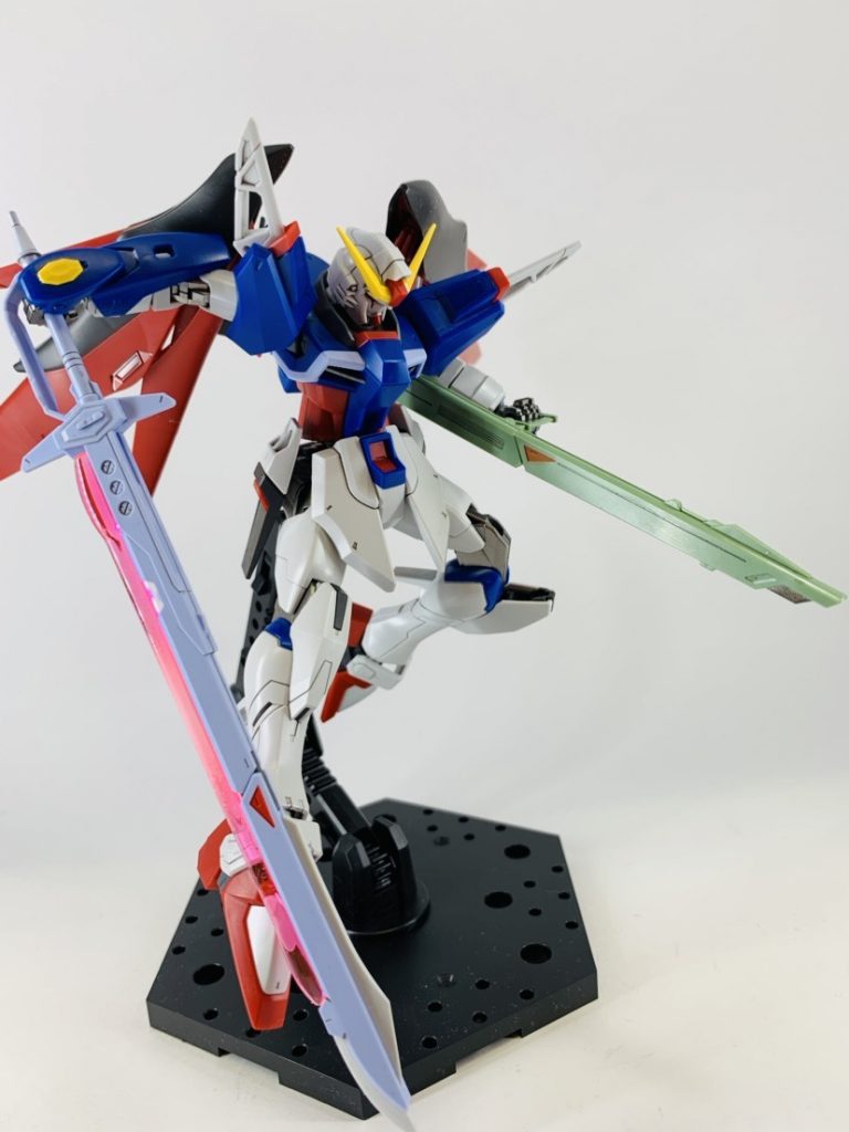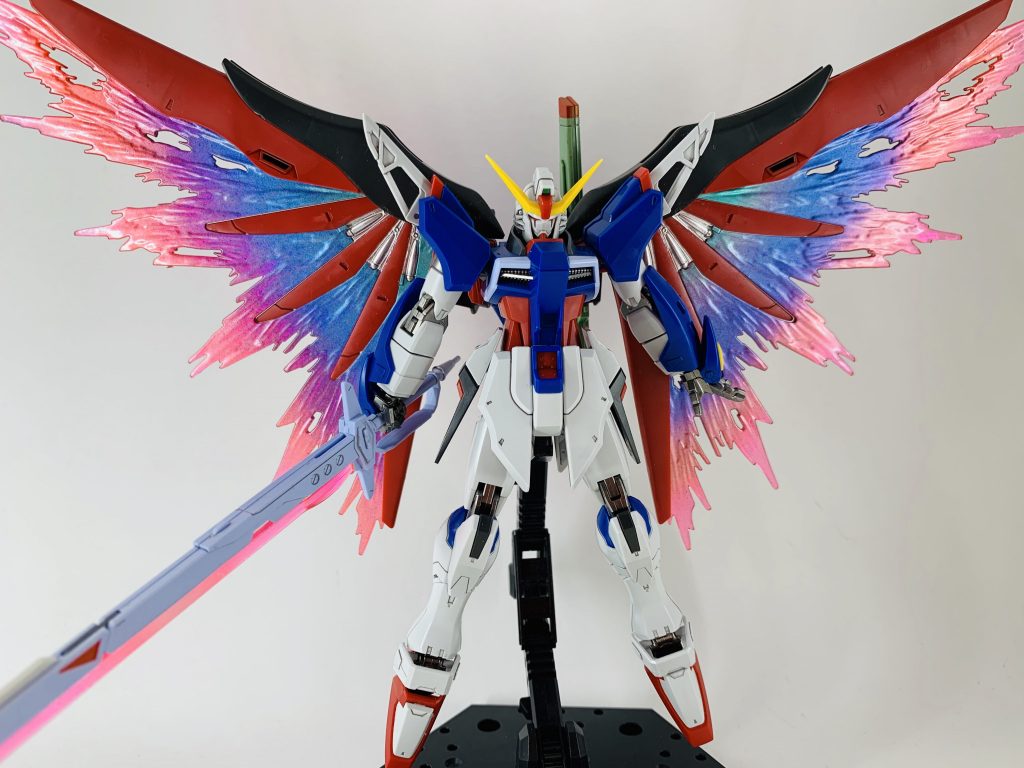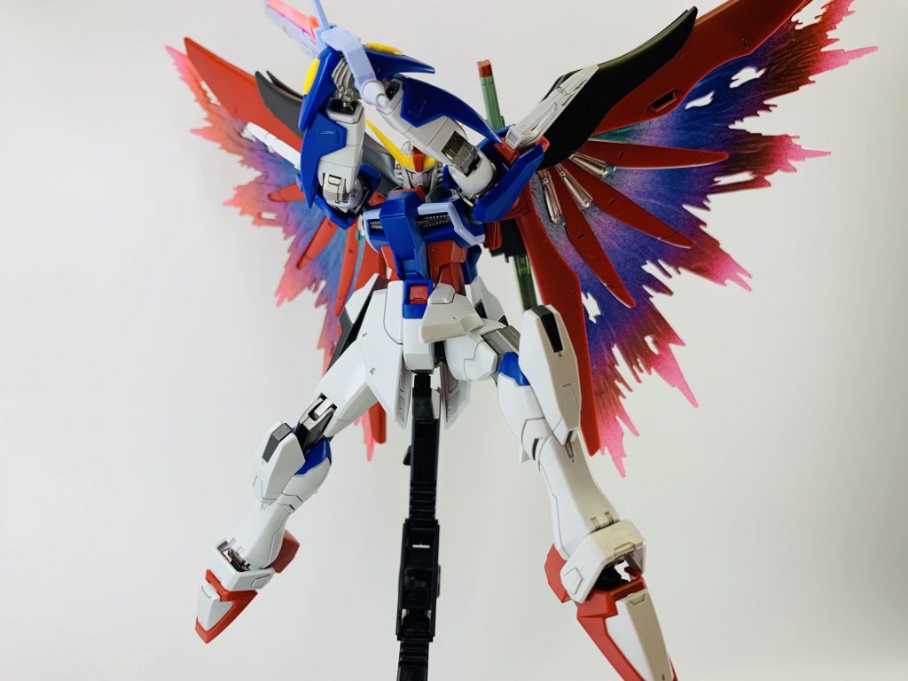 光の翼はMGのホログラムの質感を拡大解釈し、虹のように光が放出するイメージでグラデーション塗装しました。武器類のビームエフェクトもグラデーションをかけています。