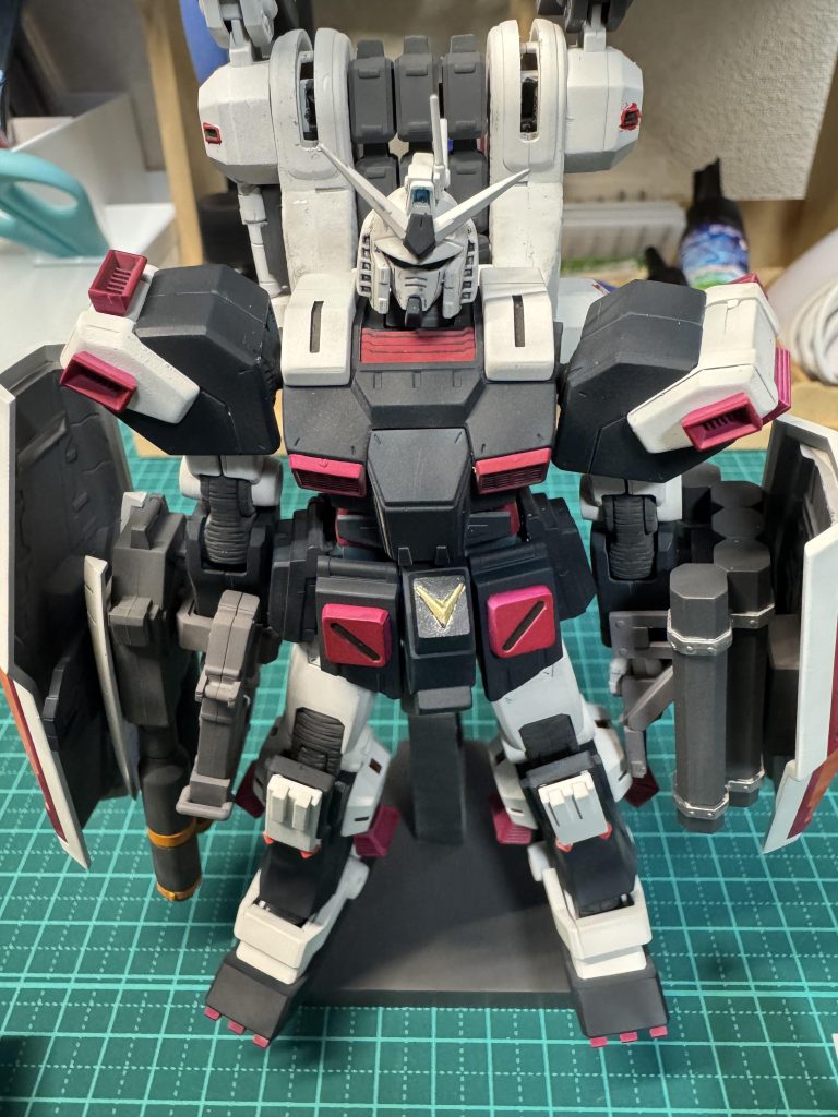 FAガンダムTBのシールド右腕にそのまま使おうとしたのですが、その辺にジェガンのシールド転がってたのでそっち使いました。