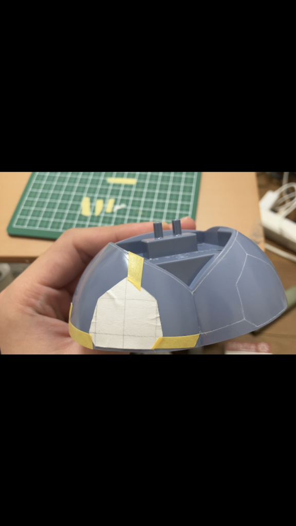 スカートのスジボリについて、前面は六角形にカットした画用紙を貼り付け、背面はブリーフのような形の画用紙を両面テープで貼り付けてそれをガイドにして行いました!