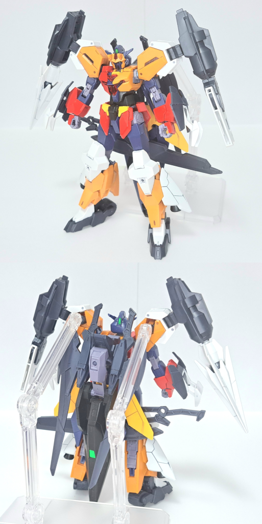只でさえポリキャップがくったくたなのに肩にアーマーのみならず武器付けたもんだからめちゃ肩下がるので後ろからスタンドで支えてます