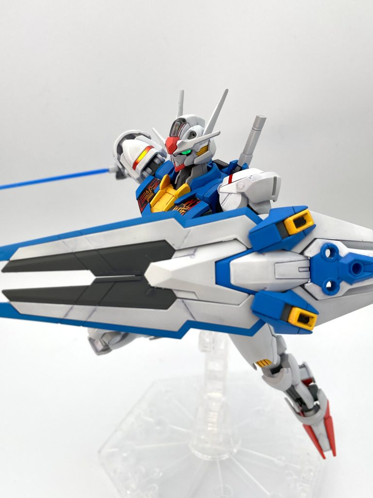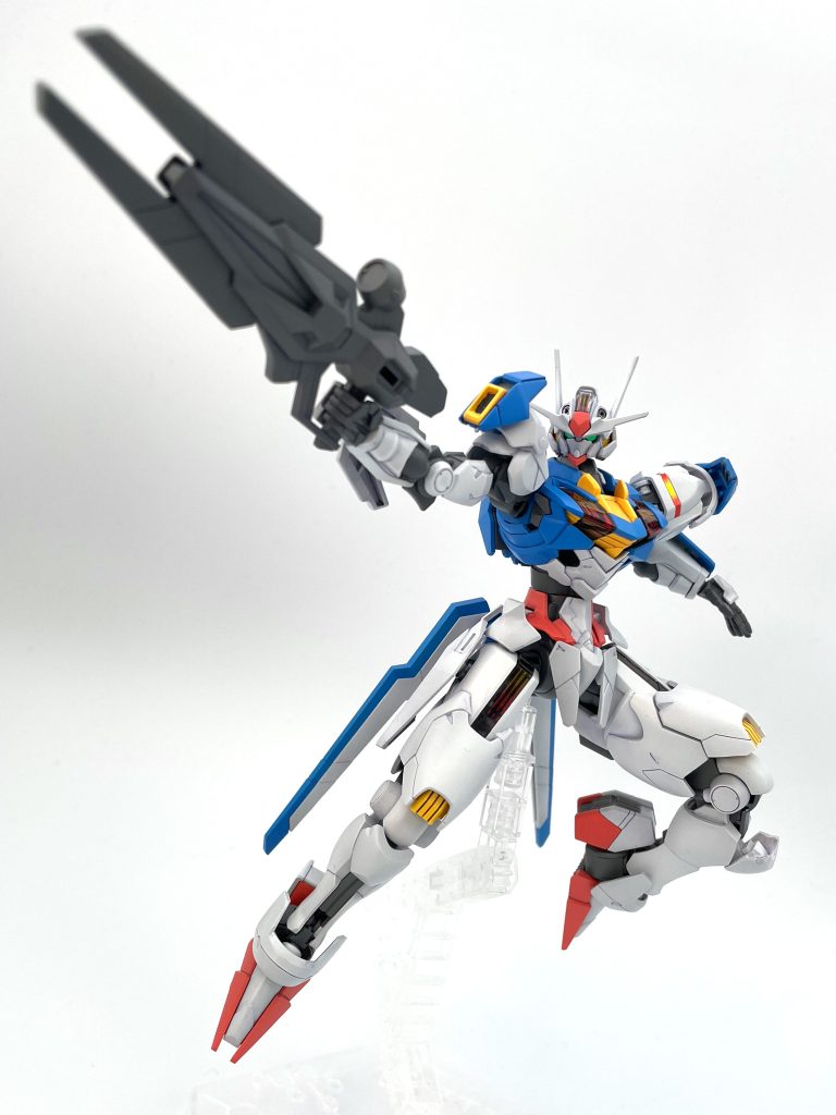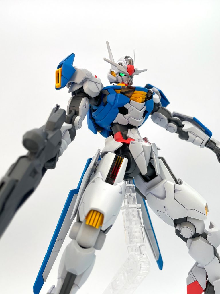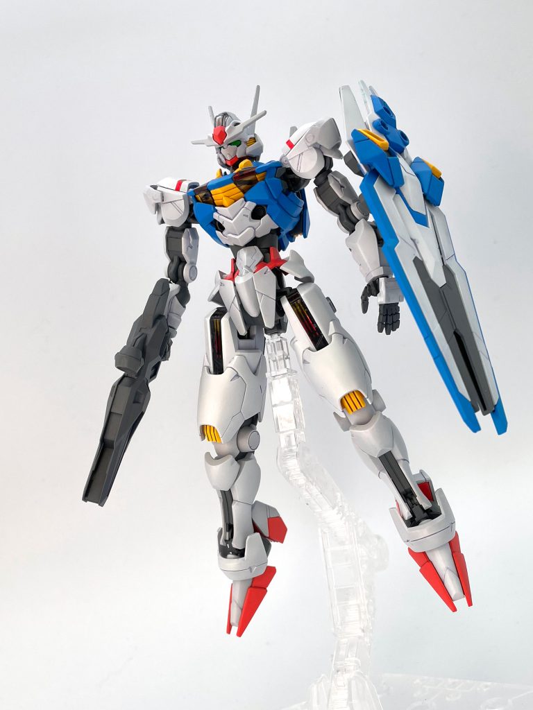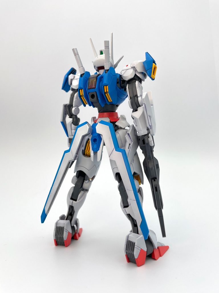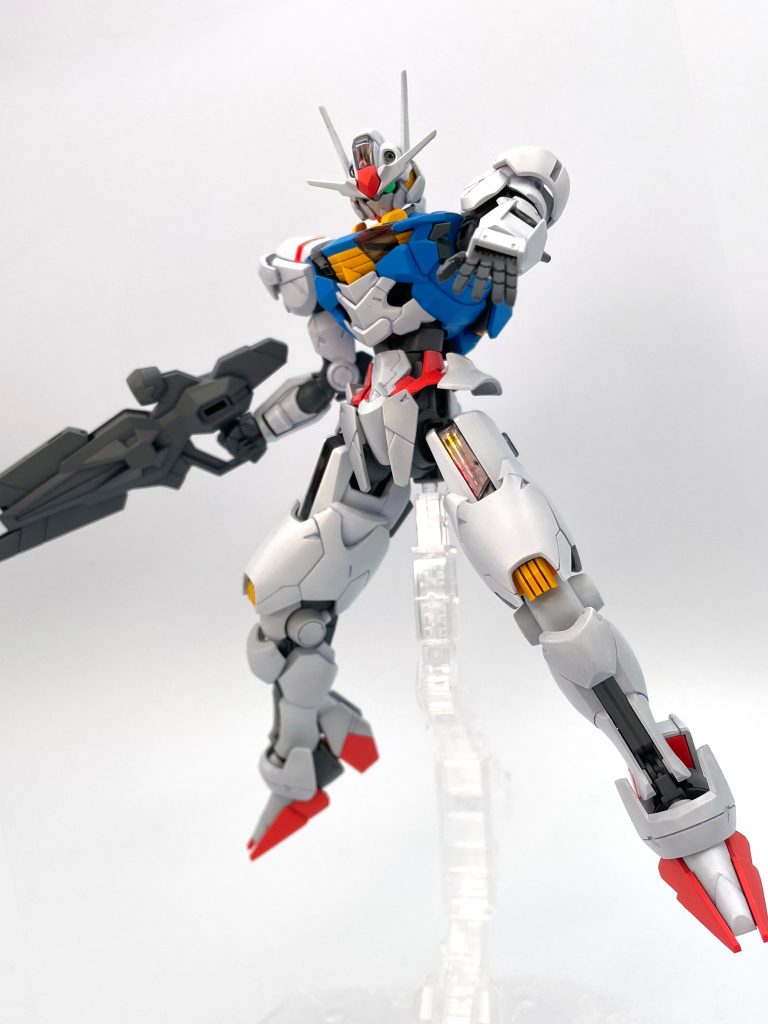 水星の魔女シリーズ的にも兵器だ部隊だ戦争だって作品でもないですし、このエアリアルは温室的なコロニー内使用、序盤でメンテが行き届いている状態とも思うので、キレイな発色でシンプルな表現があっているかなと思いました。