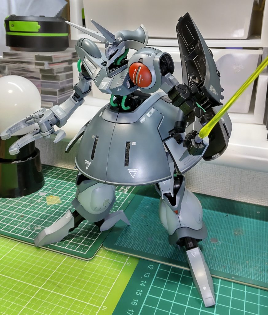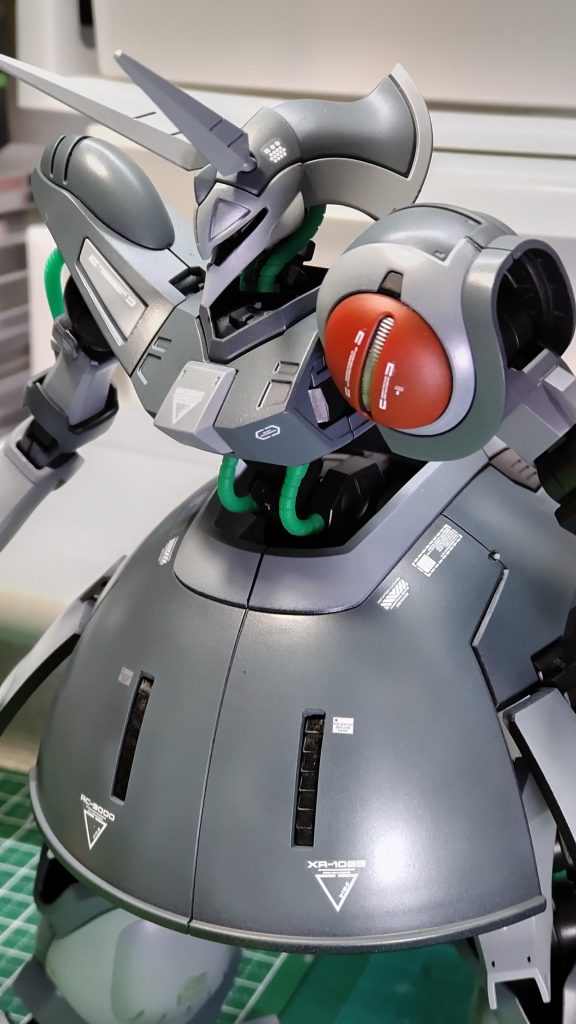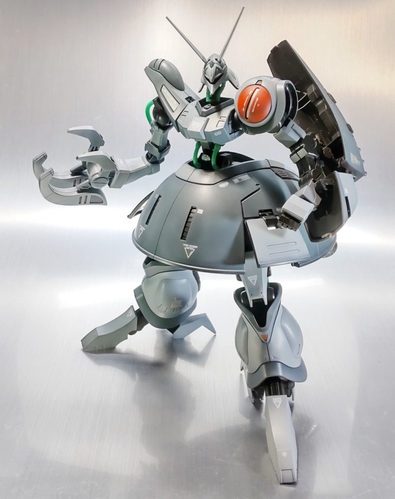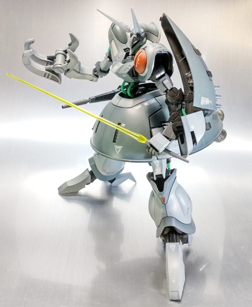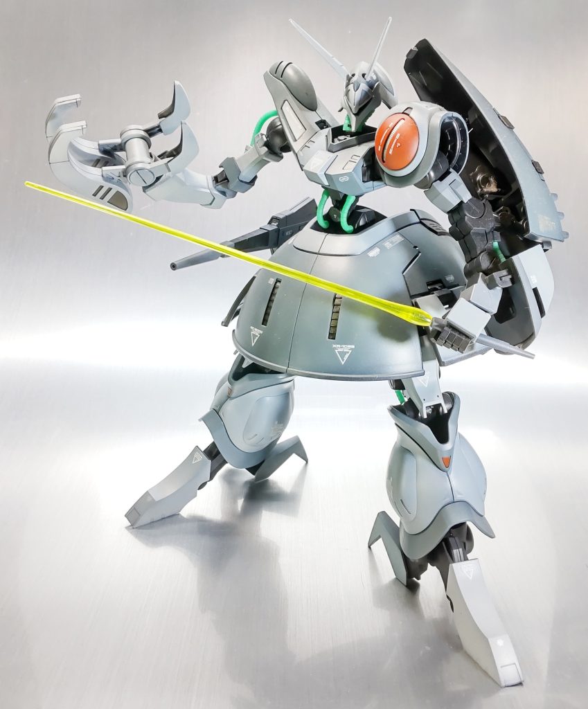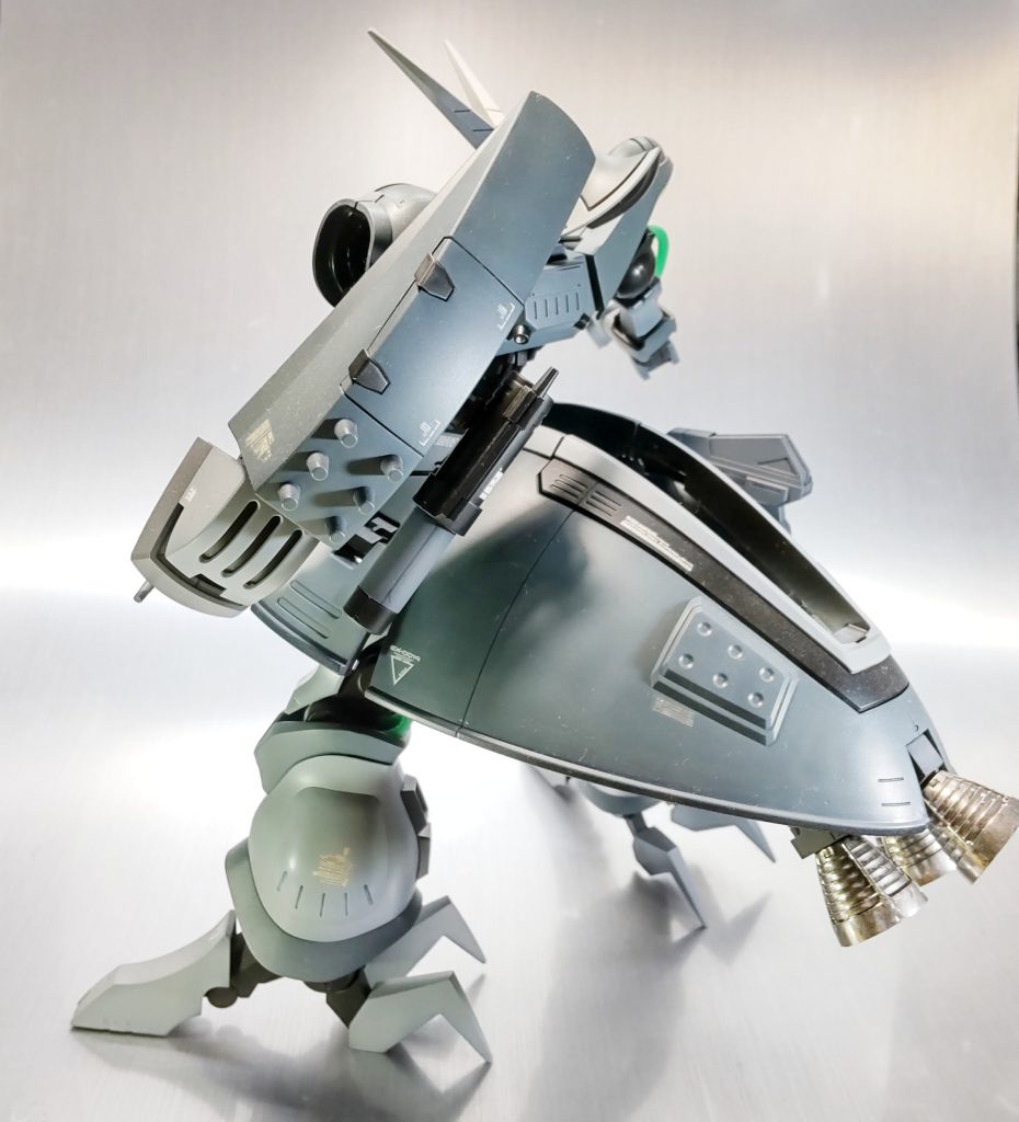 昔作品です。ウイングコンにデスサイズ参戦し写真撮影の環境整えたので、仕舞い込んである作品のRe.撮影公開です。残念ながら関節の可動域や変形の手順が忘却の彼方で塗装ハゲも嫌なので変形は断念です…..です。。本機は勢い勇んで某所でゲーツ機を購入しました。配色はこちらが好みなので無塗装で変形ブンドド予定だったのですが、調子に乗って着色してしまいました。配色はほぼそのままですが左肩に赤色入れてジェリド機ライクで。赤肩って個人的にとってもいい感じです。