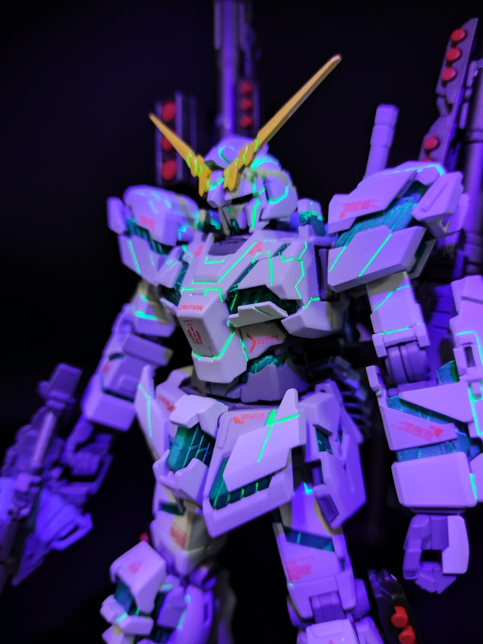 因みに、うちではブラックライトは「日亜化学の365nmブラックライト」を使ってます。遠くから照射しても蛍光塗料がキレイに発光しますし、紫色にはなりにくいです。強力すぎるのでたまにデカールの糊とかも光る場合がありますが、そこはUVカットのトップコートを何回か吹いたら光らなくなります。