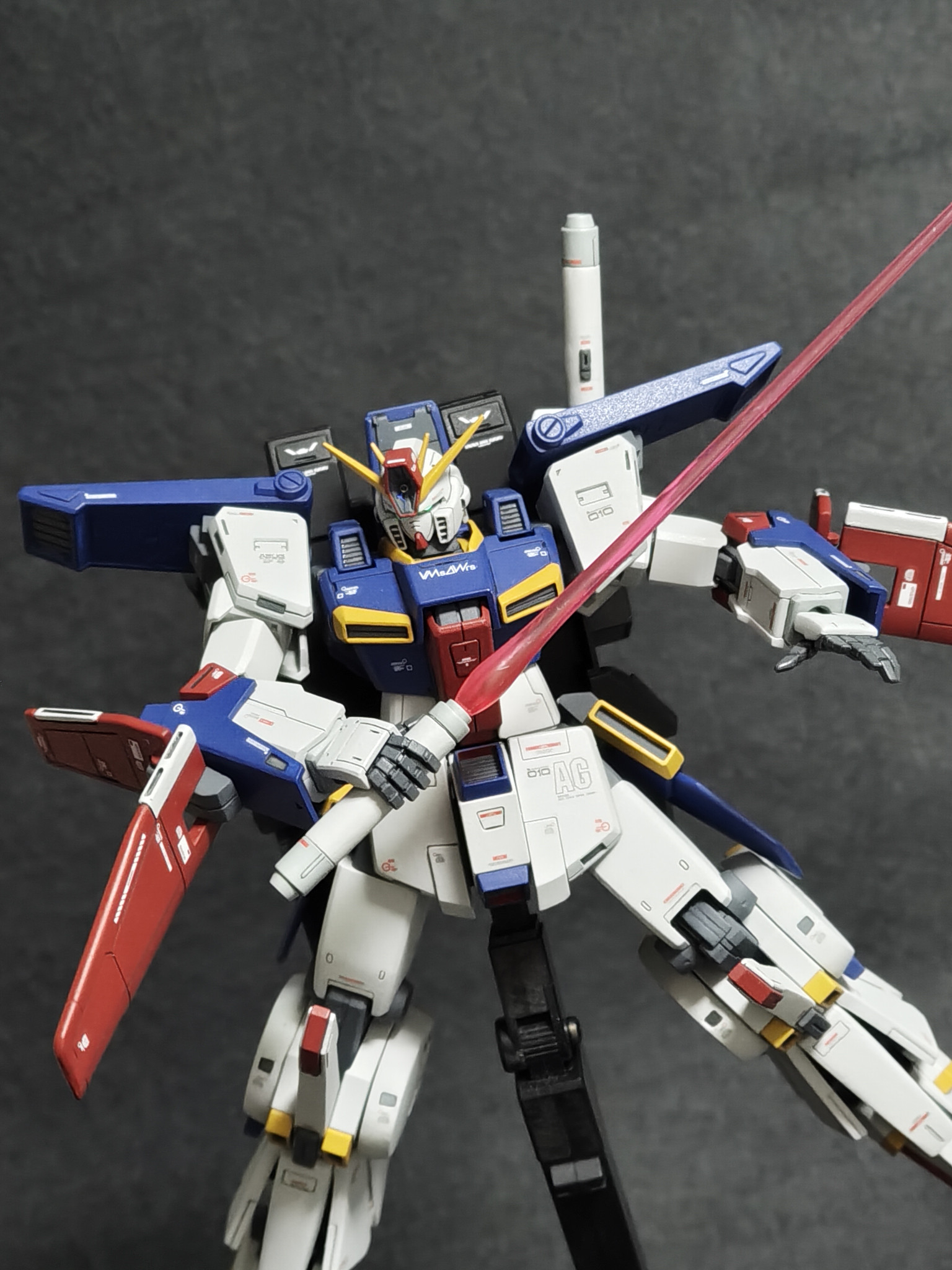 HGUCのZZを改修しました。変形は考えないでのスタイル改修を中心に行いました。ハンドパーツはビルダーズパーツを使用。デカールの一部は自作(アーティファクトの時に制作したもの)しております。