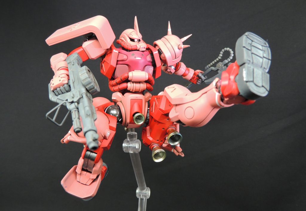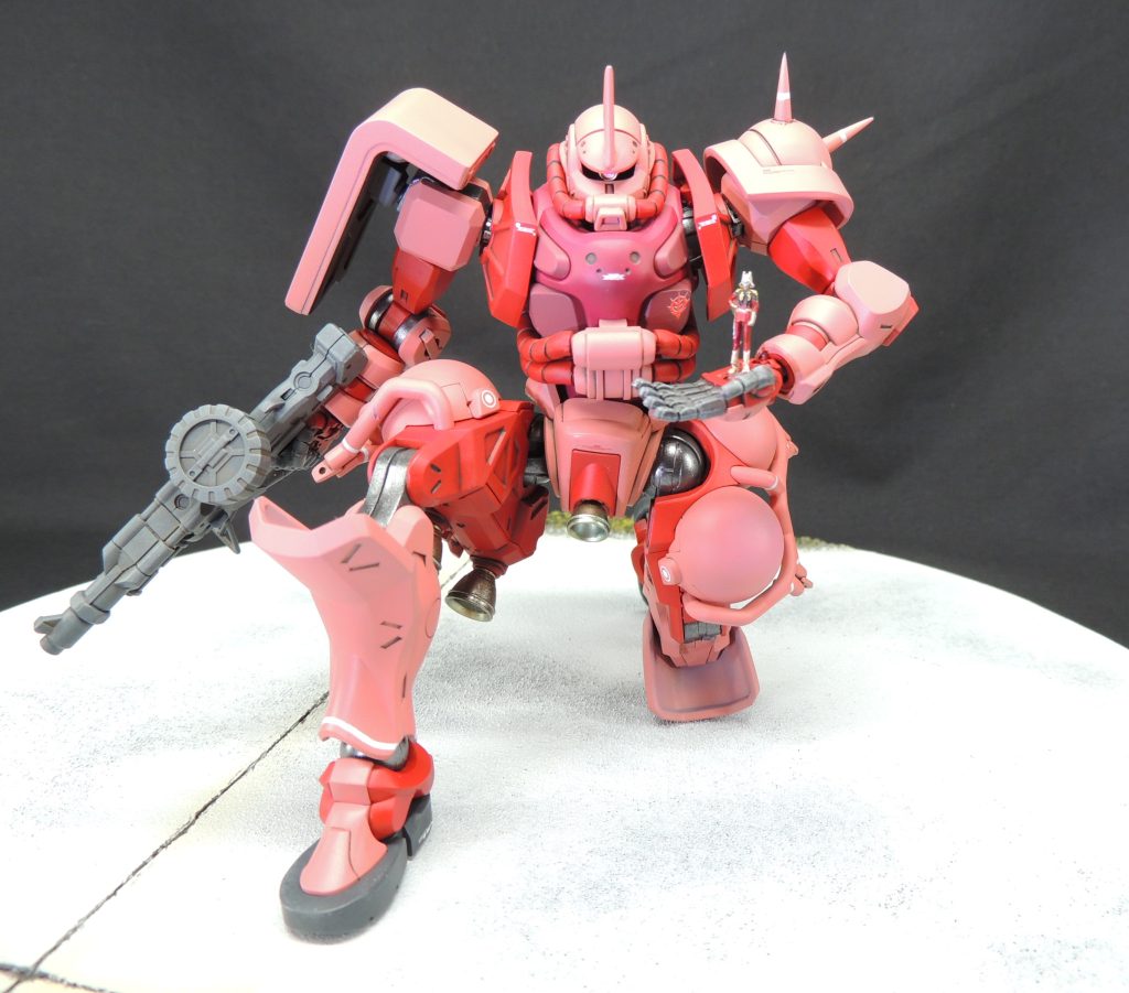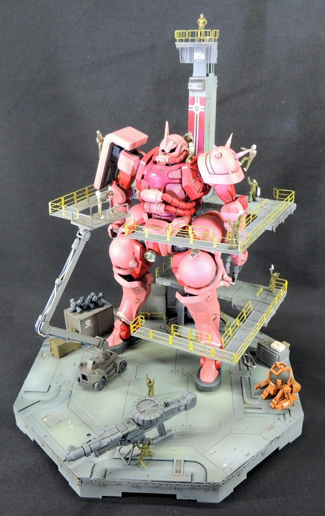 すでに多くのモデラーさんが、軍警ザクから量産型ザクやシャア専用ザクへの軍事転用!?をされていますが、十人十色の味付けがありますね。本機の塗装はガンダムカラーのシャア専用カラーをそのまま使用していますが、関節部分をメタリックにする等、若干のアレンジを加えています。ベースは、過去にRGシャア専用ザクのハッチオープンモデルを製作した際のものを転用してみました。