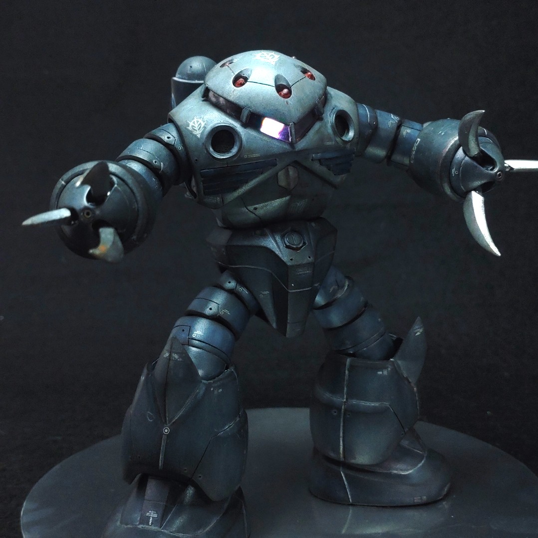 めちゃくちゃかっこいいです!ウェザリングがまた素敵です。いかにも水汚れや錆のようでたまらんです。モノアイ発光を自分もやりたい!