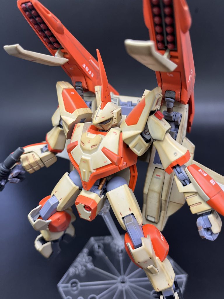 カラーリングですが、製作過程でもふれてますが、マクロスのVF-1Dのオマージュとなります。組んでみた実感としては、バトロイドというよりは、空飛ぶデストロイドみたいな雰囲気になりました。