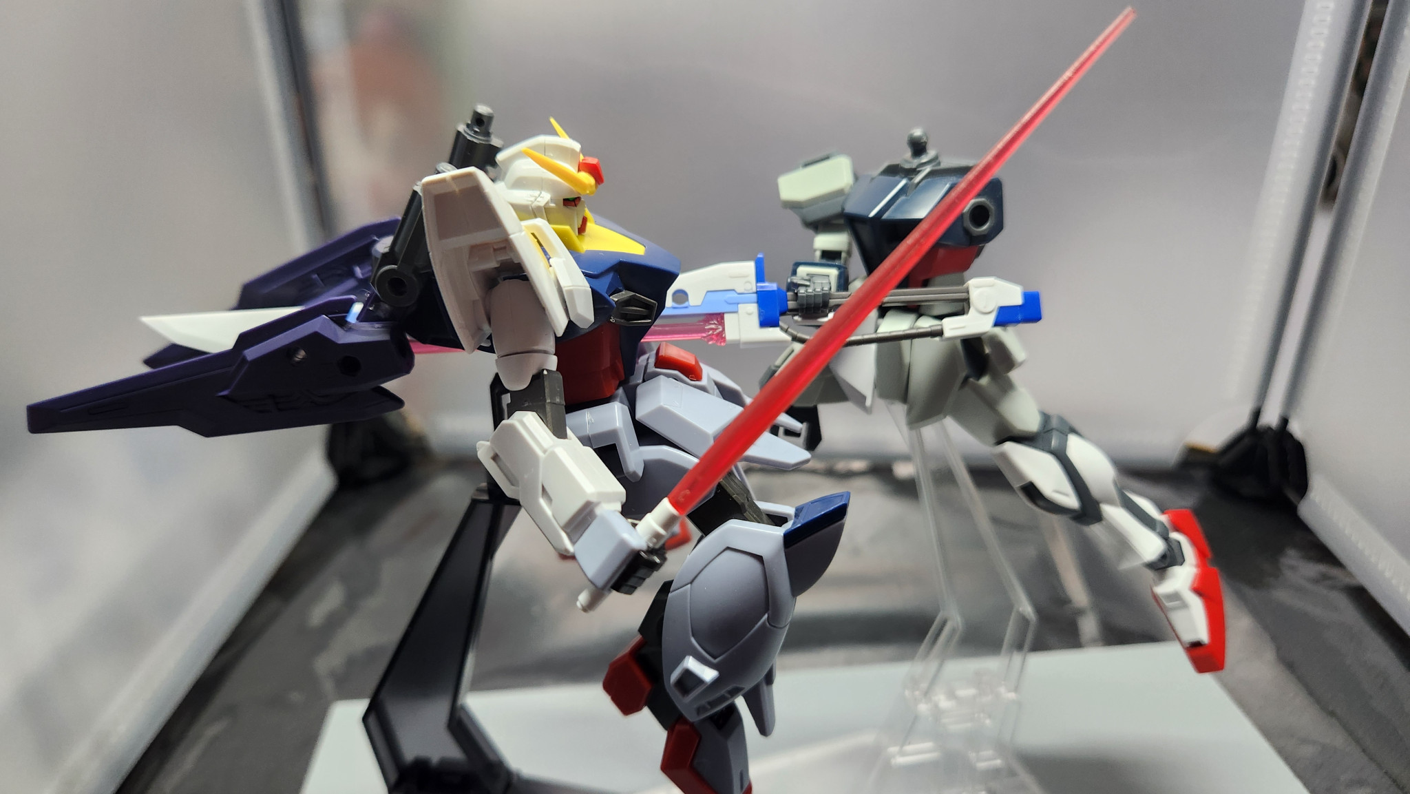 ライバル機として作りましたが、実は家にあるジャンクだけで作りました。バックパックと頭部をミキシングに使って残ったプロヴィデンス、Pストのボディ、リボーンズガンダム、あり余っていたGNソード2で製作しました。ちなみに頭は旧hgストライクのものですけど、EGストライクのと全然違いますね。