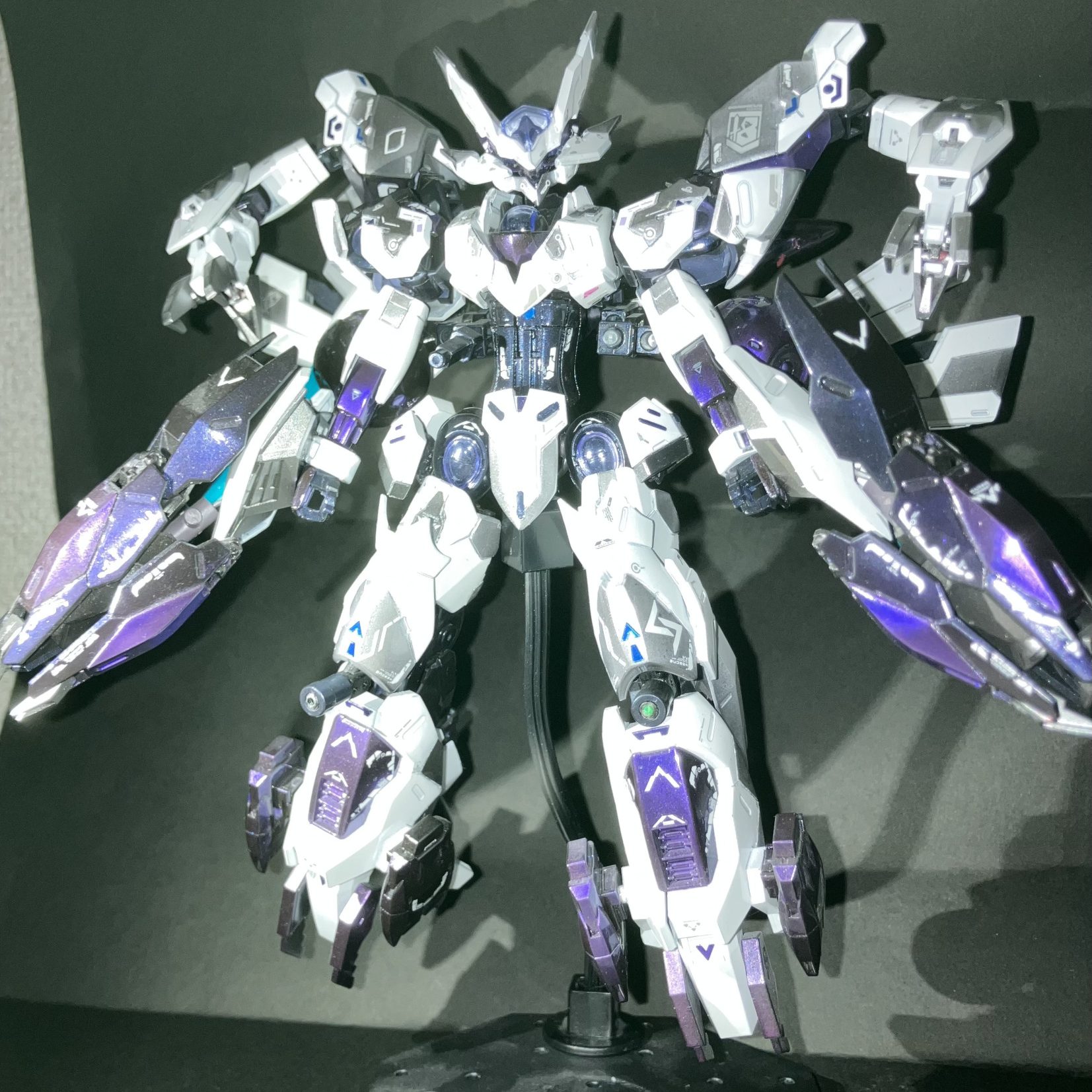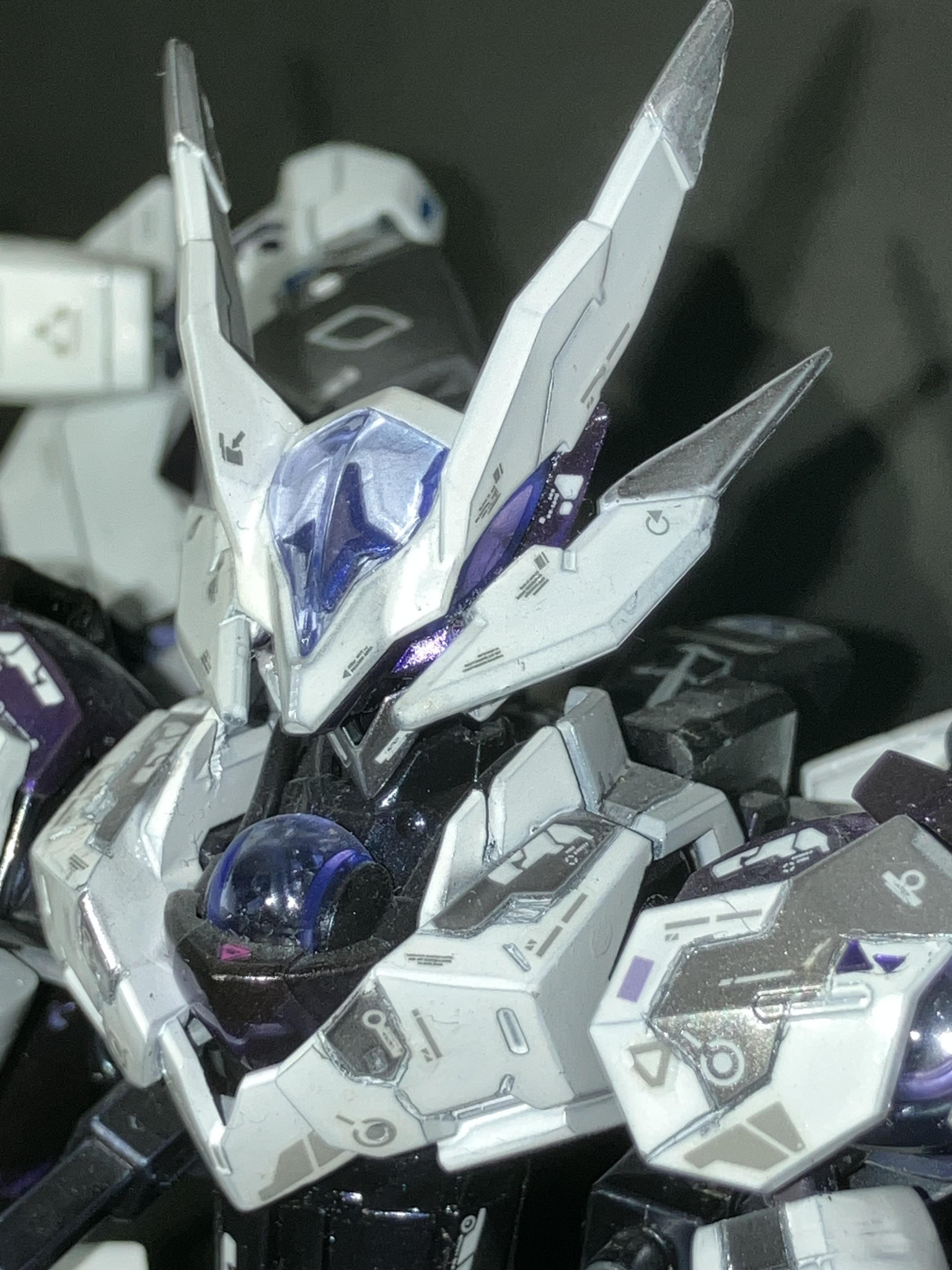 ベギルベウトルシュの展開した時の脚の大きさに合わせて全体をミキシング盛りました。胴体をミカエリスのものにし、腕、胴体、首を延長しています。装甲や武装の一部は2種のパープルのキャンディ塗装ですが暗めで画像だと色分けがわかりにくいです。顔はベギルベウトルシュ(ケナンジ機)のものにミカエリスのアンテナ×2、ミカエリスのマスクの下部分を接着し元のデザインを残しつつ騎士のマスクに見えるようにしました。