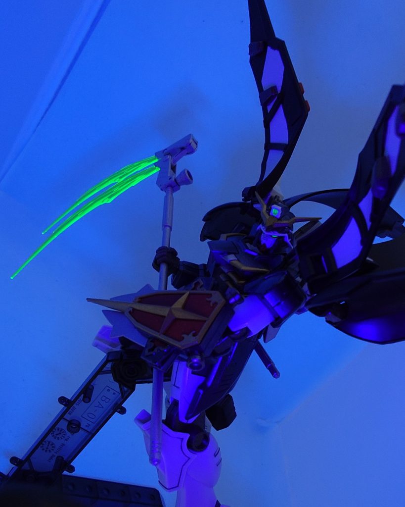 - ガイアノーツの蛍光グリーンでツインアイ等塗装し、ブラックライト照射で光るように。