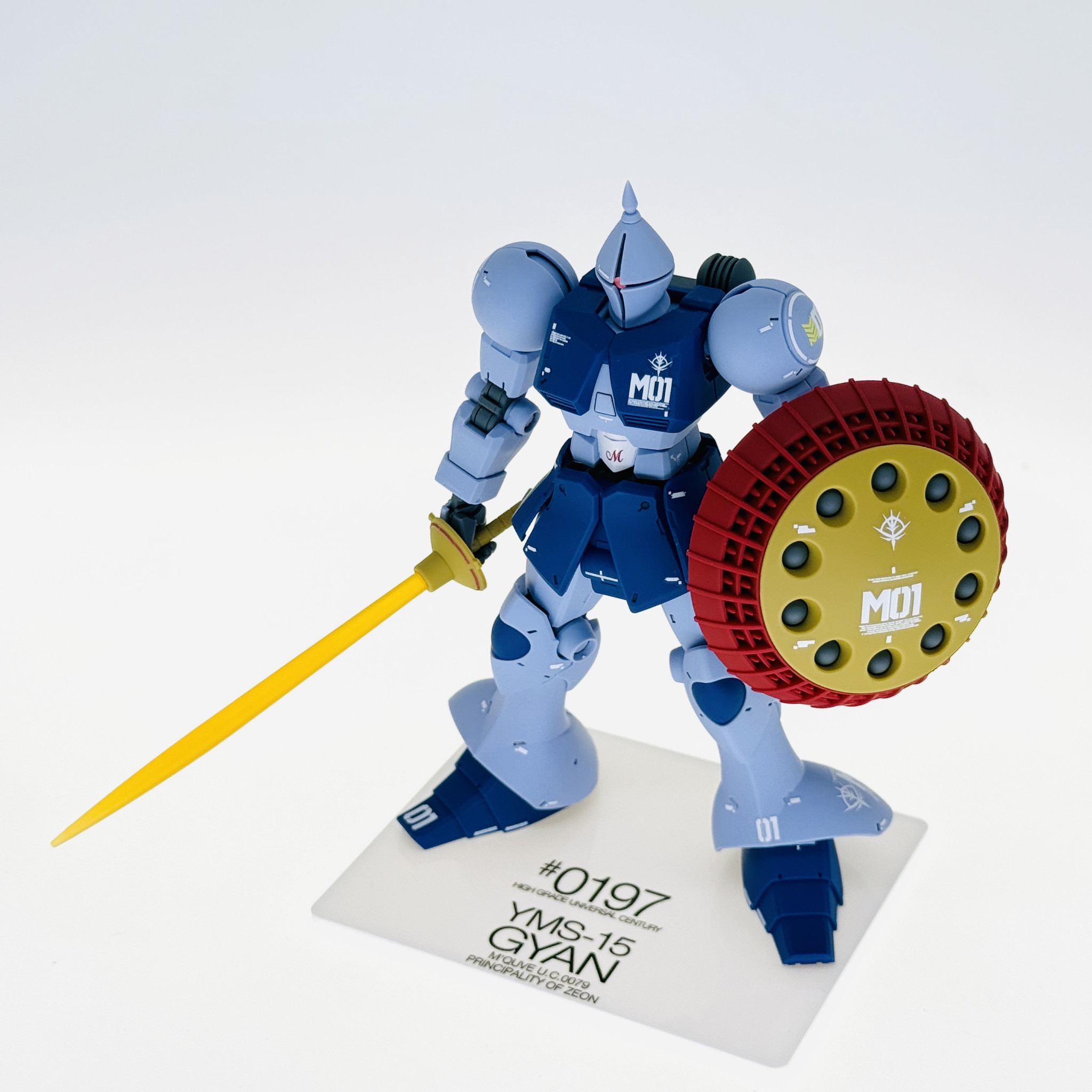 YMS-15 ギャンはズマダイ社が開発した白兵戦特化型モビルスーツで、超大型ビームサーベルを装備し、遠距離武器はシールド内の牽制用小型ミサイルとフロート機雷のみです。うち1機のテスト機がマ・クベ大佐専用機として配備され、全体のシルエットは甲冑を纏った西洋騎士の趣を呈しています。特に頭頂部のスパイク形状は研磨が難しく、当方ではやや研磨し過ぎて量産型ギャン(『機動戦士ガンダム ギレンの野望』)のようになってしまいました(笑)。
