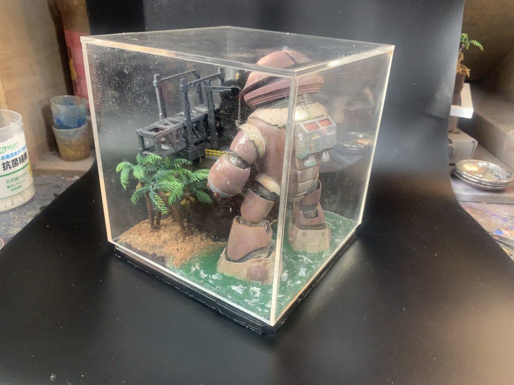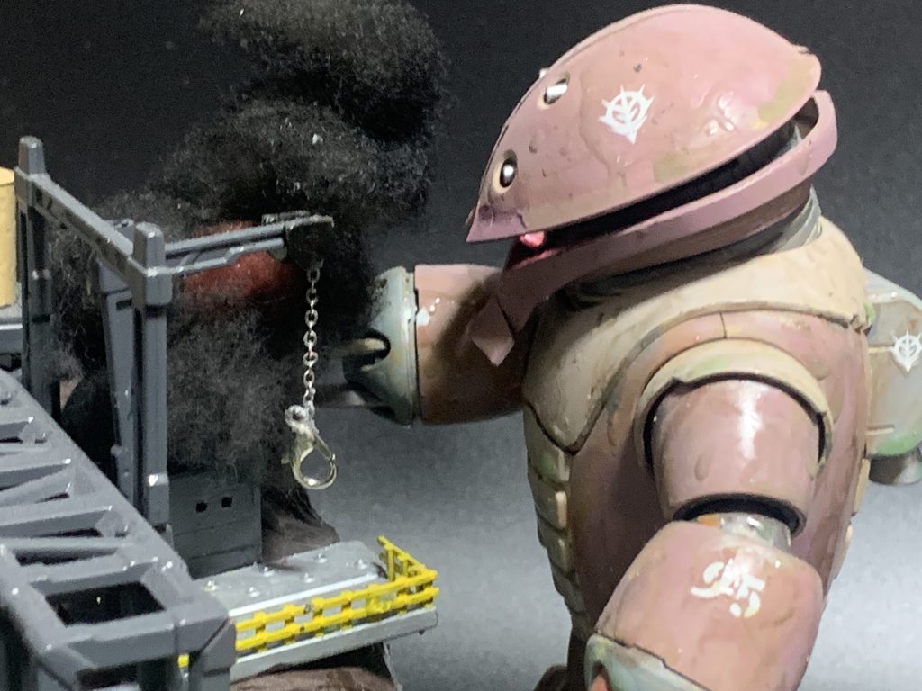 アッガイの丁寧な作り込み、ジオラマの出来栄え、共に素晴らしい作例ですが最後の画像のアクリルケースが非常に気になります。