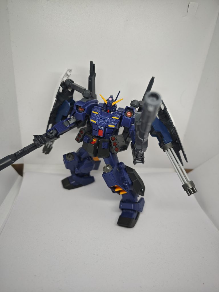 ベースとして頭部と脚部はヘイズル、ボディはパワードジム、腕部はライトニングガンダムを使用しています。両手に持つ武装はM.G.Sのハンドバズーカです。逆手持ちにすることで取り回しを良くしています。