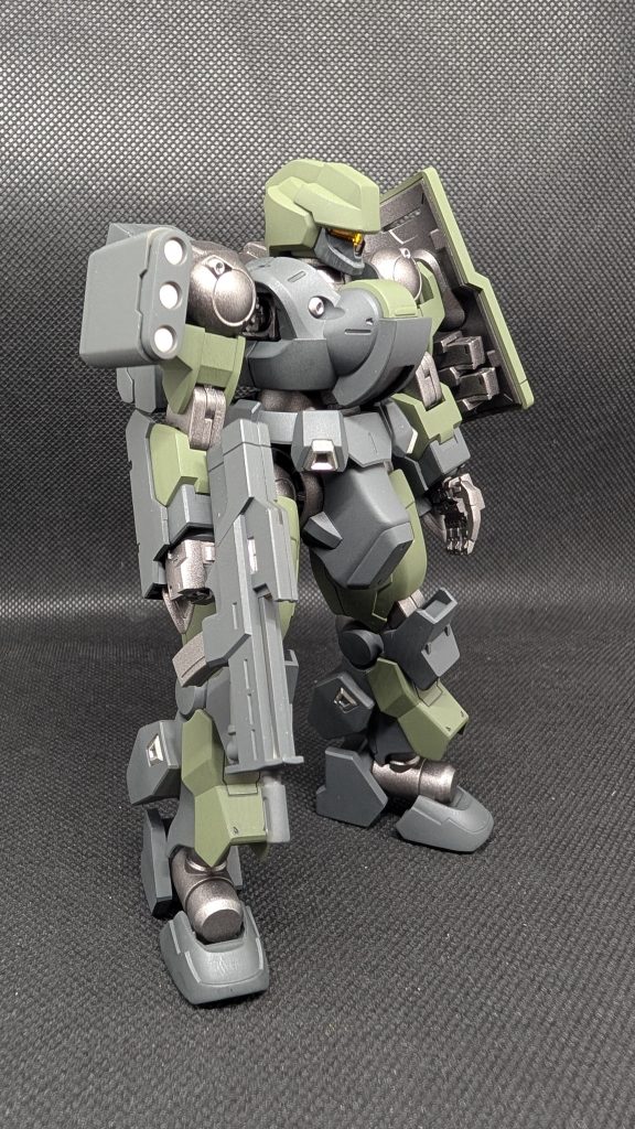 緑:タミヤアクリル NATOグリーン 黒:タミヤアクリルNATOブラック 関節色:水性ホビーカラー焼鉄色 バーニア等の差し色のシルバー:RAY STUDIO リアリティマーカー あとはタミヤエナメルを少々
