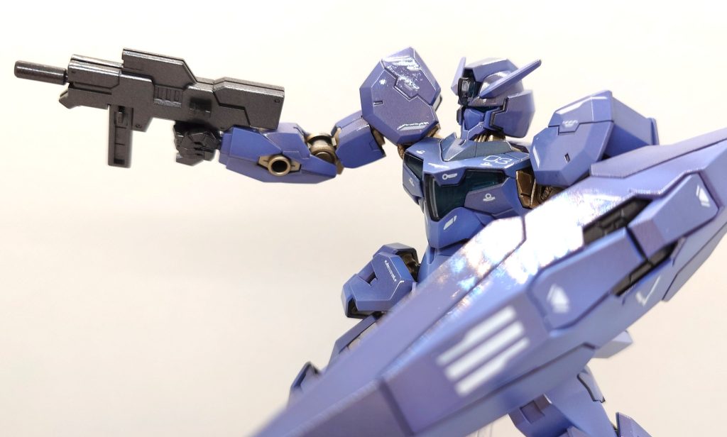 下地のガンメタが、上塗りのクリアーホワイトのクリアーの部分が干渉して青く見えるのでは?と推測しています。当初の目論見で、白より色味を目指していたのは内緒です(gundam-kao5)