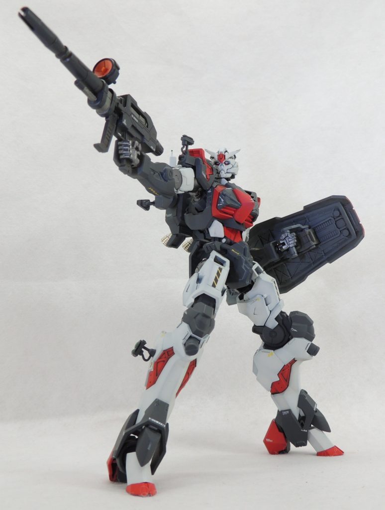 今回は元キットのガンダムダンタリオンの出来の良さに助けられました。V字アンテナの設置、腹部装甲の追加、足の小型化、ランドセルの設置、以上4点のポイントを絞った改造だけで、ほぼダンタリオンの原型を保ったままで仕上げています。胸、腕、脚部にトラス状のモールドがあらかじめあるため、丁寧に塗り分けるだけで「試作機」の雰囲気を出すことができました。