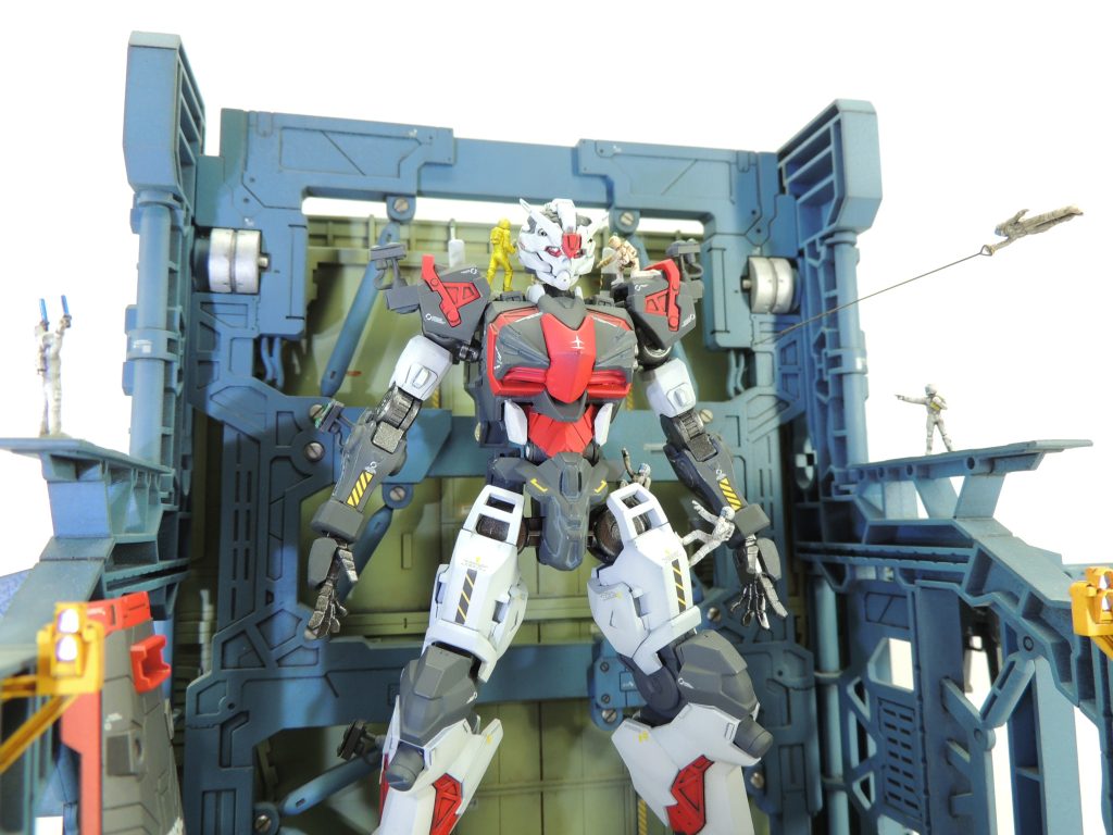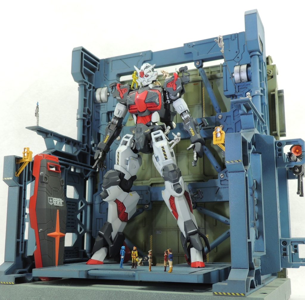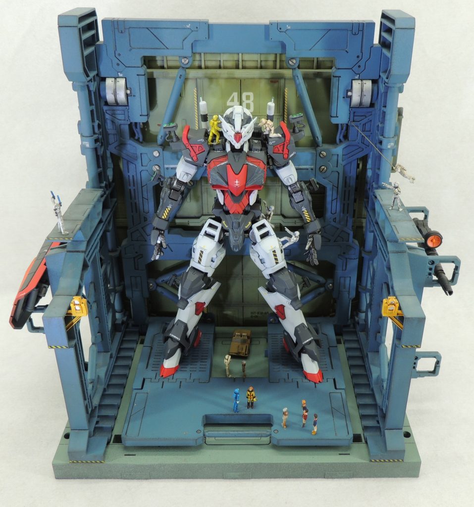 過去作の格納庫の簡易ジオラマにディスプレイした様子です。フィギュアはビルダーズパーツのほか、ランナーやパテから自作したものを使用しました。
