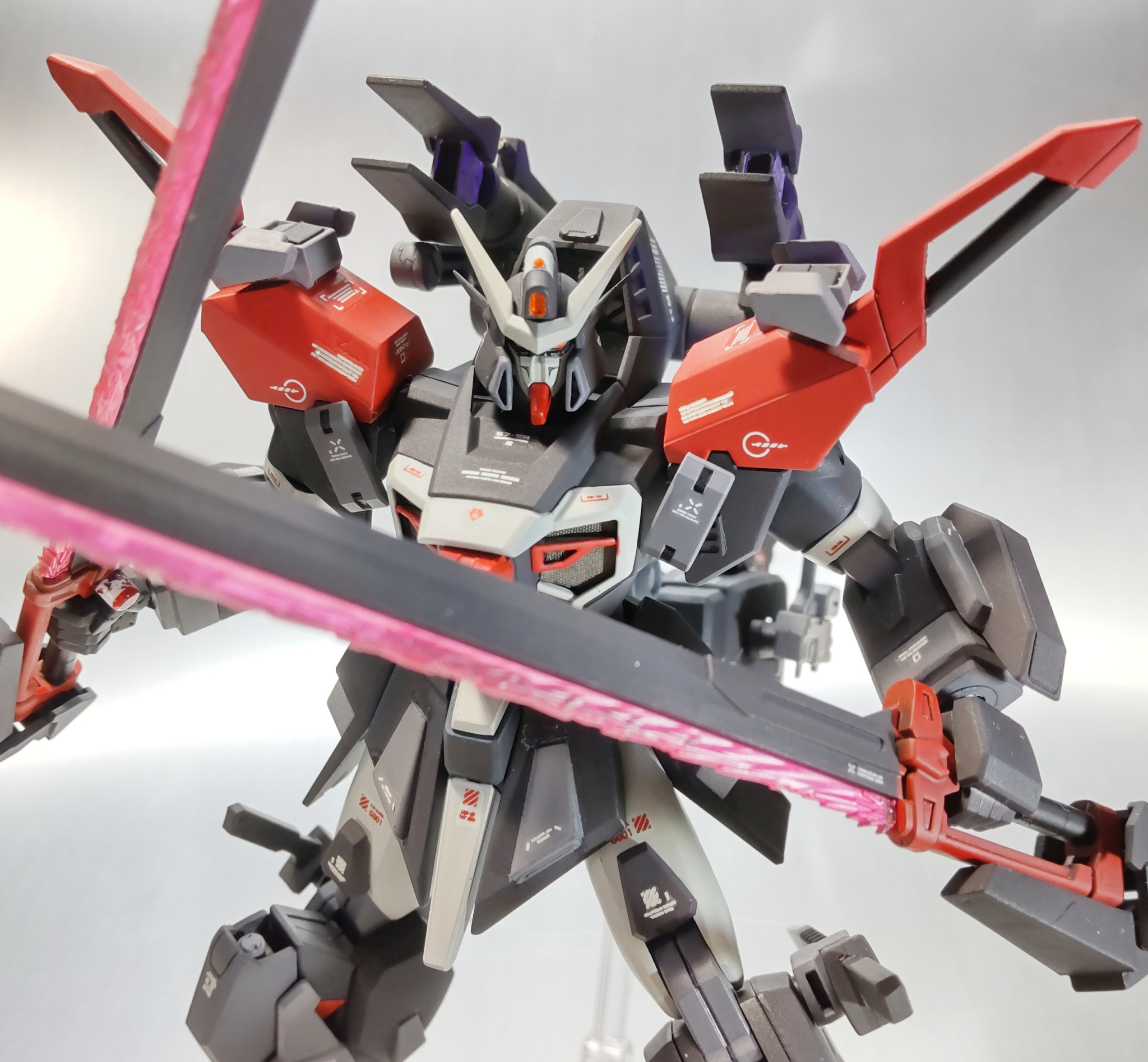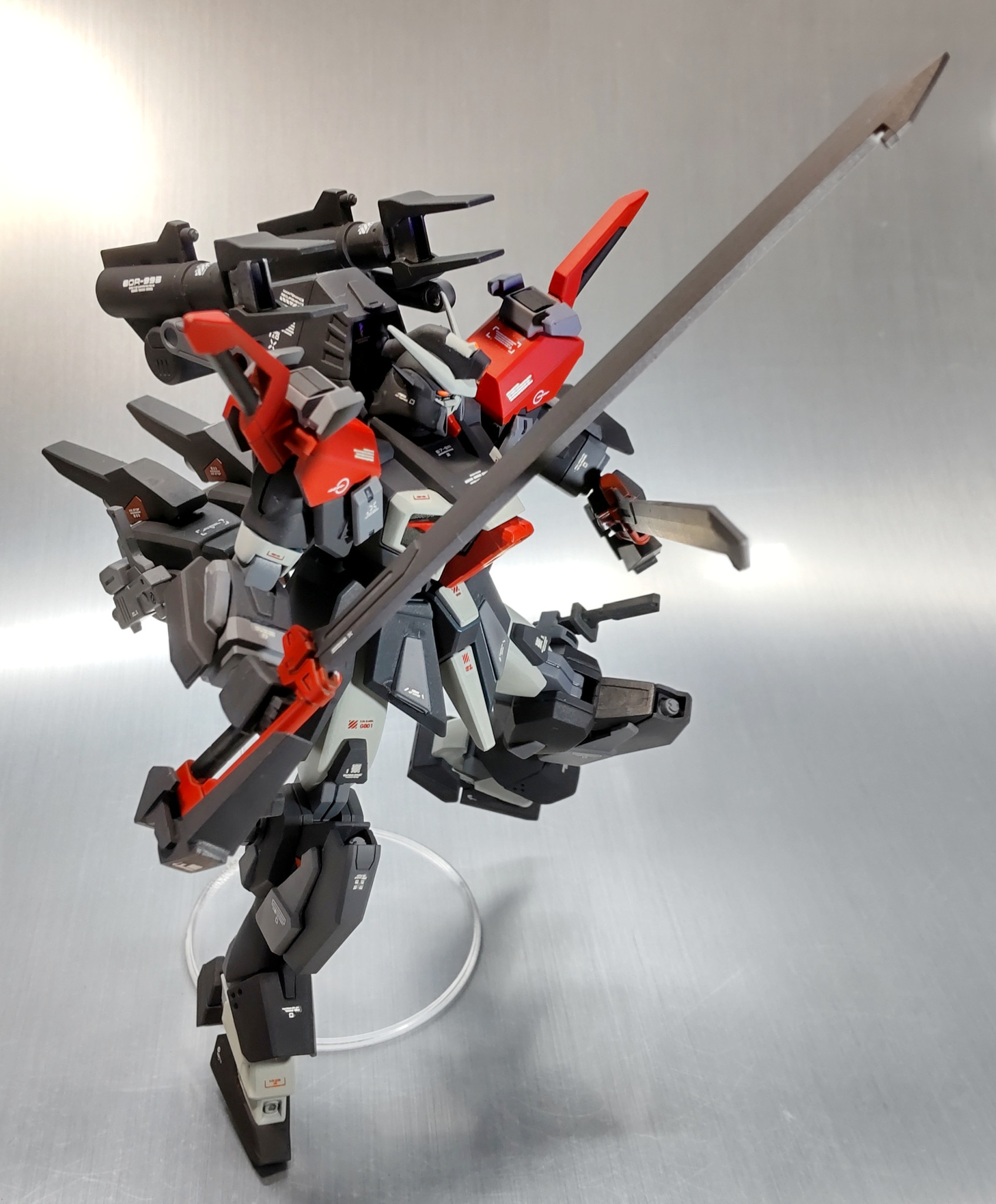 姿態の主な改修は、太ももとスネで計12mm延長、腕をソードGに付替、腹ビームは埋めて出っ張りに、背中の2門は先端切断し左右逆にして肩の部品を先端に付けて砲っぽく、両肩エモノと対艦刀はソードGから拝借。腹の模様みたいなダクトにアミアミシート切り抜いて貼ったりしてますがいまいち見栄えは期待ほどはなく、フェイスもハイニューの顔も付け替えられるようにしましたがとっかえる手間がかかるのでちょっともったいなかったかも。頭部のトサカはだいぶ削ってランナーのそれっぽい部分を加工して別部品っぽく装着しました。腰に追加ブースター装着。これはストライクのエールが余っていたのでなんとか活用したいと検討した結果がこれでした。無くてもイイカカナ。小銃2丁の保管場所としては必要なので付けます。剣以外に取り回しいい火器無かったのでせめて小銃は持たせてあげたかったので剣と同じく2丁持ちで見た目もいいかと。
