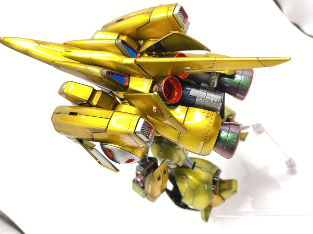 今回、バーニアの塗装は黒サフの上からミラーネイルパウダーのグリーン・レッドをのっけてみました