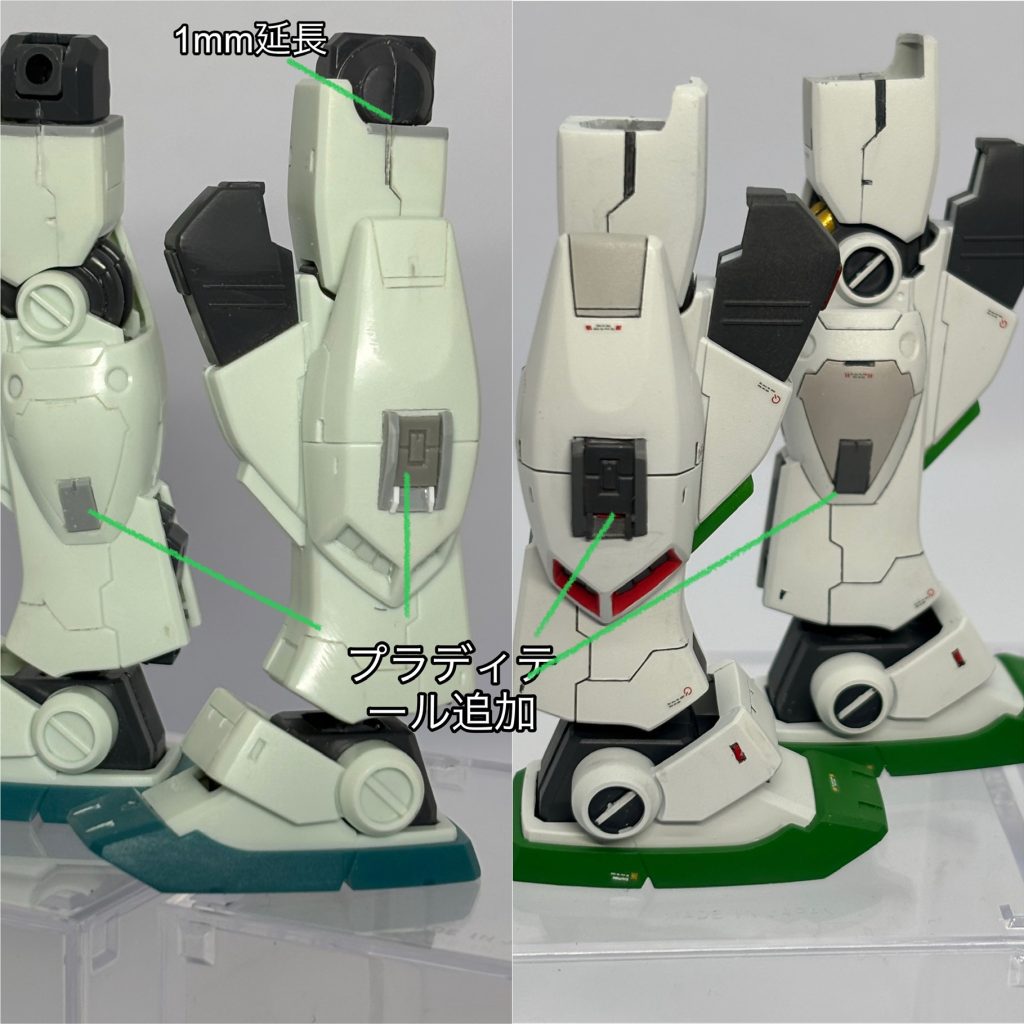 腰部は寸詰まり感を解消するため、コクピットブロックごと2.5mm延長。地球連邦軍系のMGを制作するにあたっての定番工作ですね。