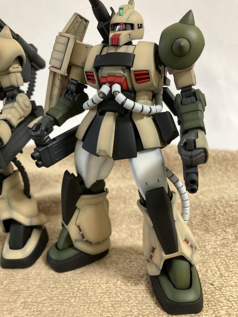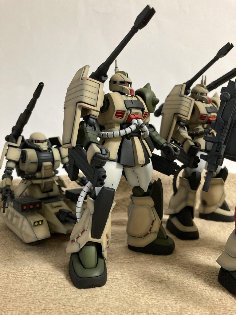 ザクキャノンカッコイイ!確かに色はもう少し濃い目が設定に近いのかもしれませんが、統一感優先で正解と思います。どこぞのま○艦隊よりメリハリがあります(笑)ザクキャノンの緑がいい味だしてます。ビッグガンを構える後ろ姿がたまりませんね。最後の一機も楽しみにしてます。なんか砂漠戦仕様ってロマンがありますよね。