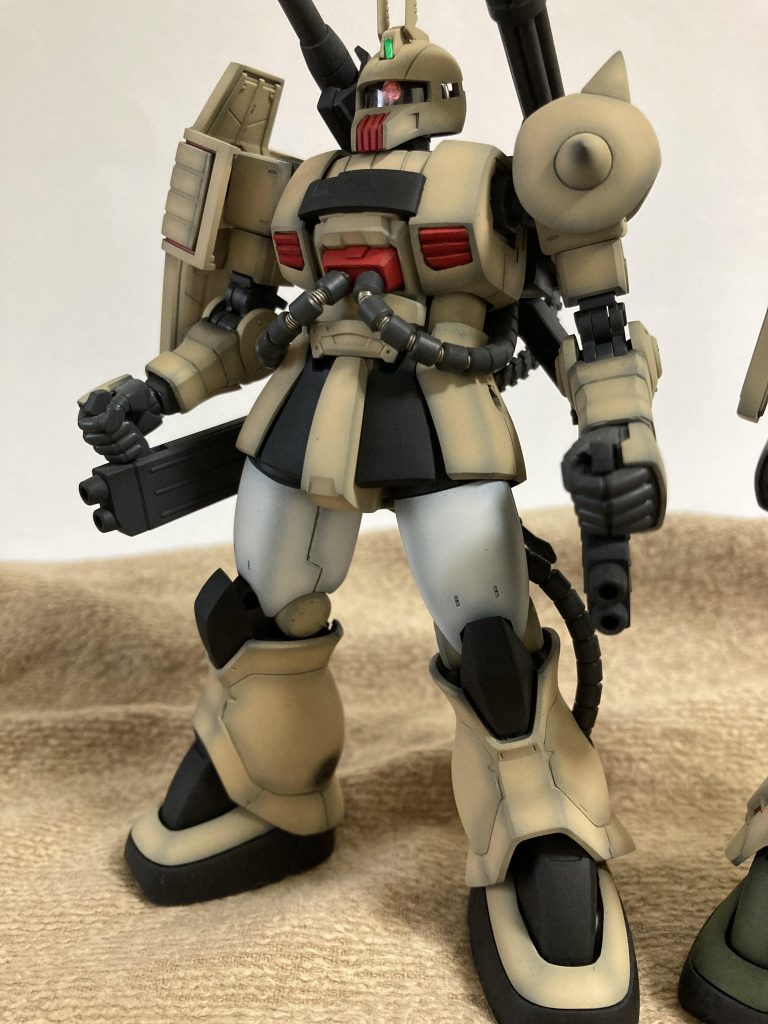 オリジン版でザクキャノンを普通に購入すると緑っぽいカラー(アレはアレでカッコいいのですか…)になるのですが、MSVを代表するザクキャノンのカラー+部隊のサンドカラーを混ぜた感じで統一感を出しました。