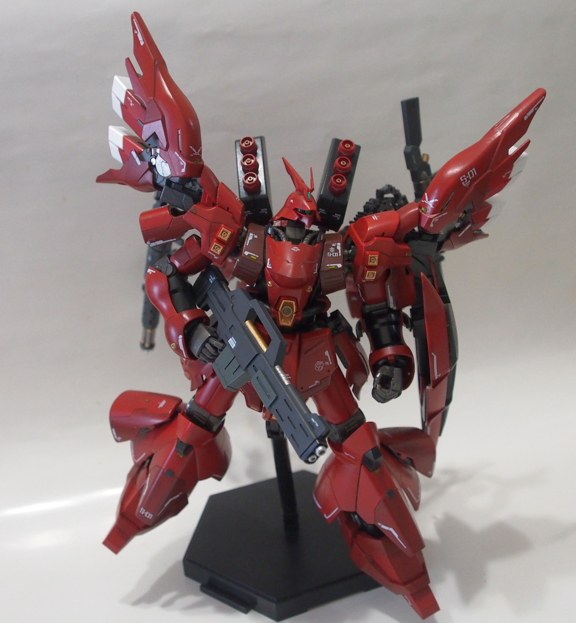 素のサザビーから大きくイメージは変えず、シナンジュのスラスターやパーツ類をもとからそういうデザインであったよう配置することに気を配りました。