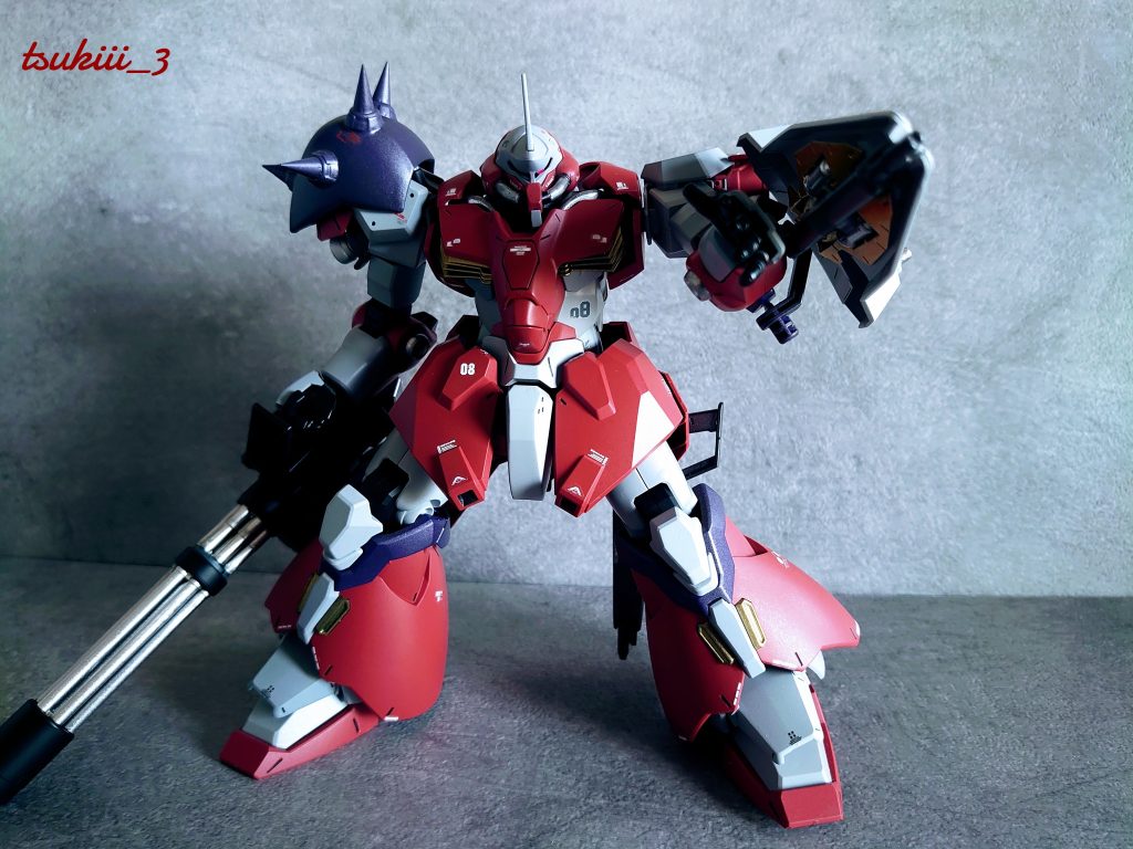 カラーリングは、クエスのヤクト・ドーガに寄せみました。スパイクアーマーや、各部アーマーはダークヴァイオレットに。ベースカラーは原型機のアイボリーからグレーに。コンクリートのようなグレーが特徴です。