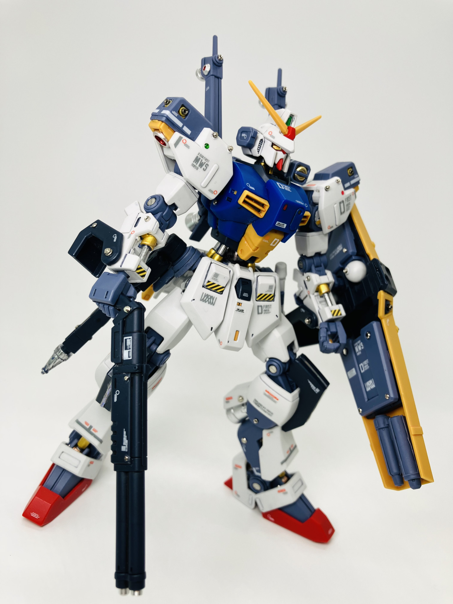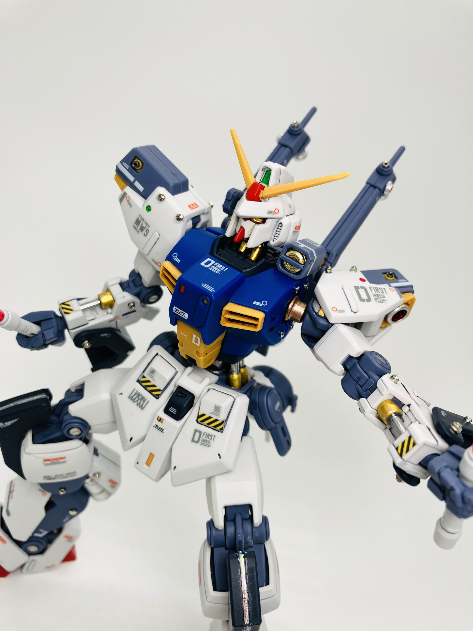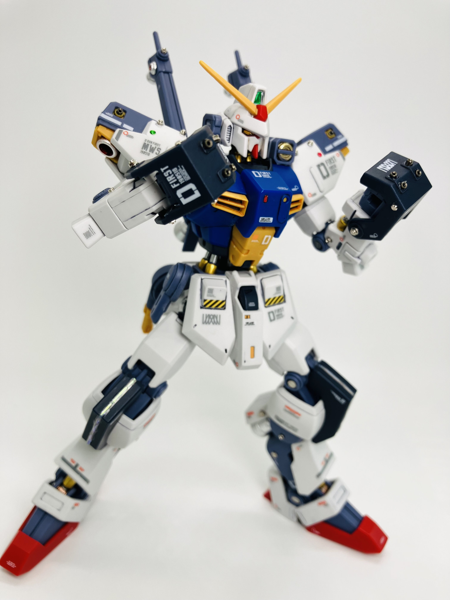 どこか兵器のようなリアルさを垣間見える機体🥳 オデコをイングラムっぽく端に5箇所穴開けましたが失敗し、いつものデカールで装飾、関節ラバーなんかも似合いそうです😉